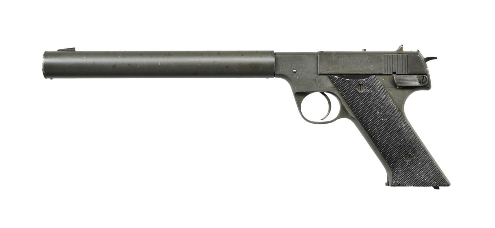 Cal. 22lr. S# 128611 (Pistol & suppressor) Bbl.8". Since the May 1, 1960 Soviet downing of US CIA pilot Francis Gary Powers, from his U-2 high altitude reconnaissance jet while flying deep in Russian territory over the Ural Mountains, the CIA "Secret spy pistol" has no longer been a secret. When the Soviets found it in his cockpit survival case they convicted him of espionage. The High Standard HD w/ integral suppressor has been an item of lore for a very long time, eventually covered in books including "OSS Special Weapons & Equipment - Spy Devices of WWII" by H. Keith Melton, and more recently, on the world wide web. This is an absolutely amazing find. Pistol is a High Standard Model HD, parkerized in finish. Right side of frame marked " PROPERTY OF U.S." above flaming bomb ordnance stamp, just rear of barrel. Suppressor measures 8" & stamped at 6 O'clock; "AVS AHF INC FAYETTEVILLE, NC / MODEL HDM CAL 22 SN 128611". Suppressor serial number matches pistol, which weighs in at 2# 13oz unloaded. Left side of receiver stamped; "MADE IN U.S.A. / THE HIGH STANDARD MFG CO. / NEW HAVEN CONN / PATENT PENDING / .22 CAL / LONG RIFLE". Pistol receiver is marked w/ serial number on front side of pistol grip. Low profile front blade sight w/ drift adjustable rear sight. External hammer w/ serrated hammer spur. Thumb safety on left side. Mag release located on bottom of pistol grip. MAGS:1 steel 10 rd. CONDITION: Matte parkerized finish is complete & consistent w/ full coverage. The only sign of prior use is some spotting, primarily on the left side, such as that typically earned in a horizontal display, or in a display case for long periods of time. Weight, within an ounce of that published in early "Restricted" documentation" indicates it hasn't been used to any extent as leading in .22 rimfire ammo can often build up over time, especially in these early, ported barrel baffle designs.. NATIONAL FIREARMS ACT SUPPRESSOR REQUIRING BATF TRANSFER BEFORE TAKING POSSESSION. FULLY TRANSFERABLE. (03-1621 / 23-992/JZ). CURIO CLASS III. $18,000-28,000.
