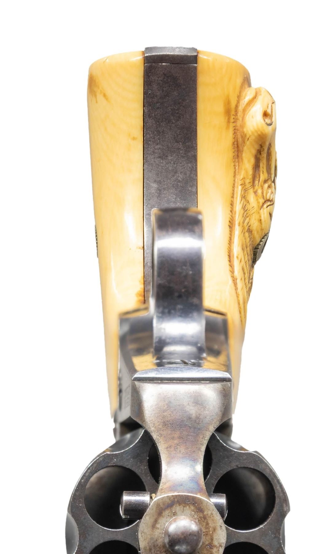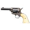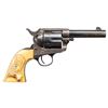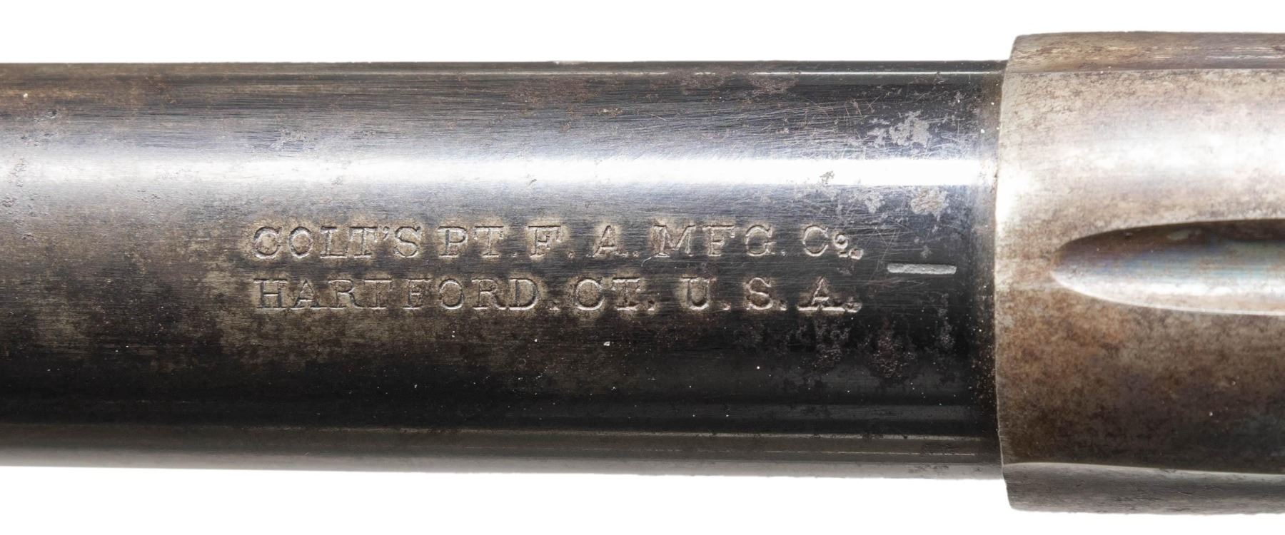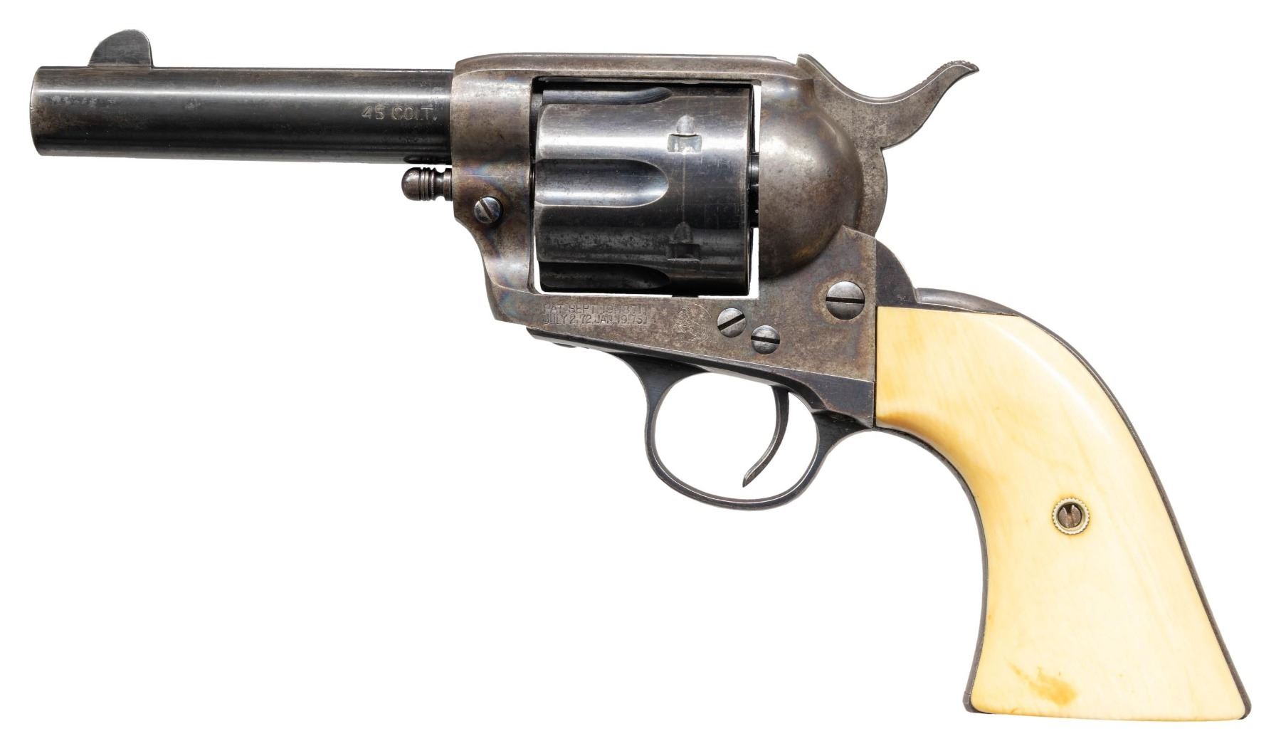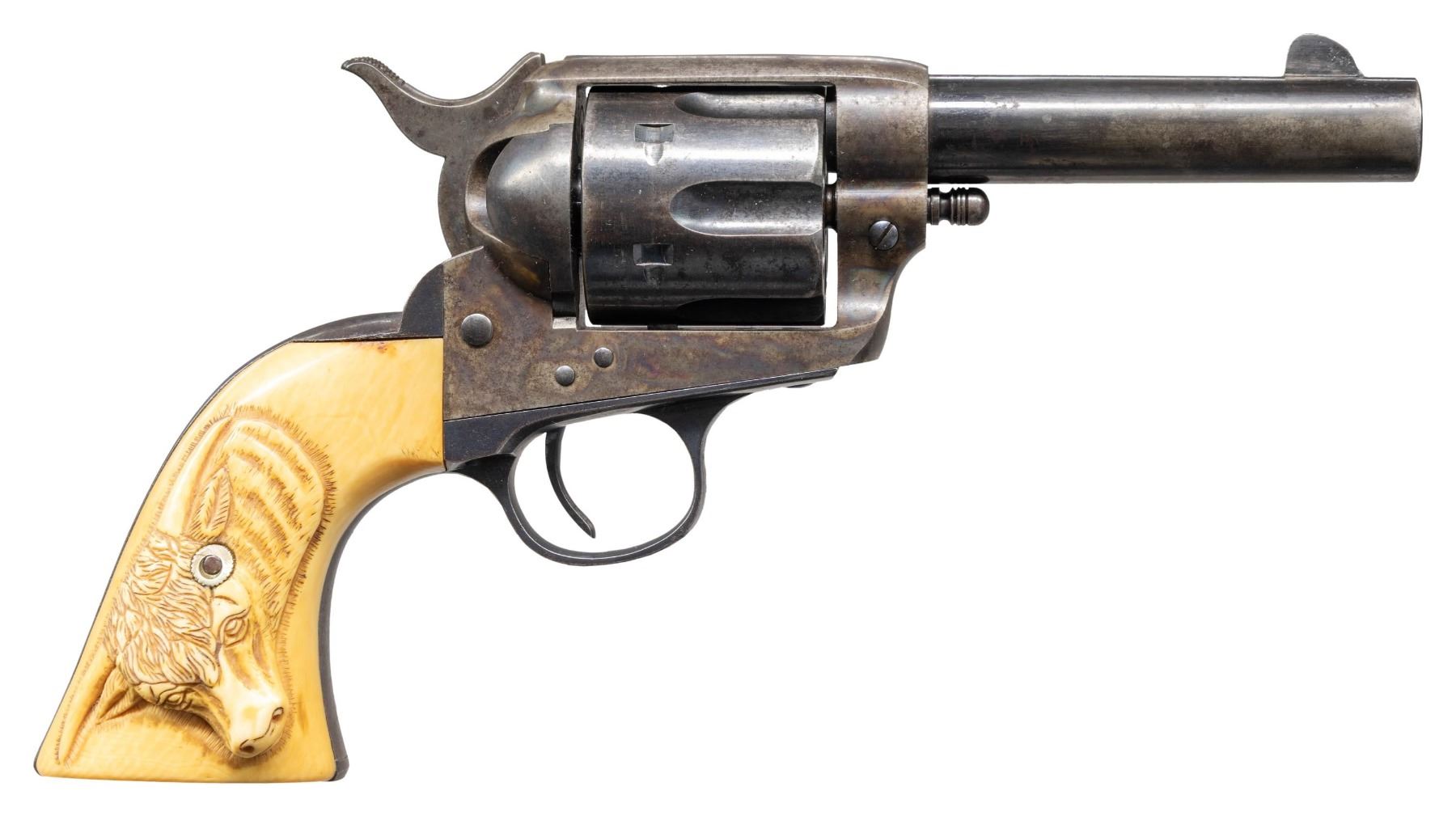 FIRST GEN. 4" COLT STOREKEEPER'S MODEL SAA REVOLVER. Cal. 45 Colt. S# 204829. Bbl. 4" ejectorless with blade front sight and 2 line bbl. address. Exceptionally rare and seldom seen with this degree of original finish. "THE OFFICIAL RECORD OF THE COLT SINGLE ACTION ARMY REVOLVER" By Don Wilkerson and Carol Wilkerson states "just under 600 ejector-less Single Action Army revolvers were produced in all calibers from 1882 to the 1930's. Survey of serial numbers 1-164100 shows a total of 70 revolvers mfg. with a 4" bbl. and blued finish. Proper 2 line bbl. address. Left side of frame has 2 line patent date and Rampant Colt in circle. Blued bbl, 6 shot fluted cyl. and grip frame. Case hardened frame & hammer. Replacement smooth white grips; right panel has raised relief carved steer head. UNATTACHED ACCESSORIES: Colt factory letter stating the following: COLT STOREKEEPER'S MODEL / Caliber: 45/c / Serial Number: 204829 / Barrel Length: 4" / Finish: Blue / Type of Stocks: Checkered Ivory / Sold to: H.L. Dyer / Address: Unavailable / Shipped to: Simmon's Hardware Company / Address: St. Louis, Missouri / Date of Shipment: July 29, 1903 / Number of Same Type Guns in Shipment: 1". CONDITION: good overall, a higher condition example than typically found. Bbl., cyl. & grip frame retain 30% original blue, fading to gray / brown patina. Case hardened frame & hammer exhibit 30% original case colors. Metal parts exhibit and even light freckling with age. All screw heads except grip screw are crisp. Very good grip is slightly undersized with only a few scattered light handling marks. Grip has acquired a pleasing yellow patina with age. Good bore retains strong rifling with scattered spots of light pitting. A very nice example of the seldom encountered Sheriff's / Storekeeper's Model. (25-6046/BH). CURIO. $16,000-24,000.