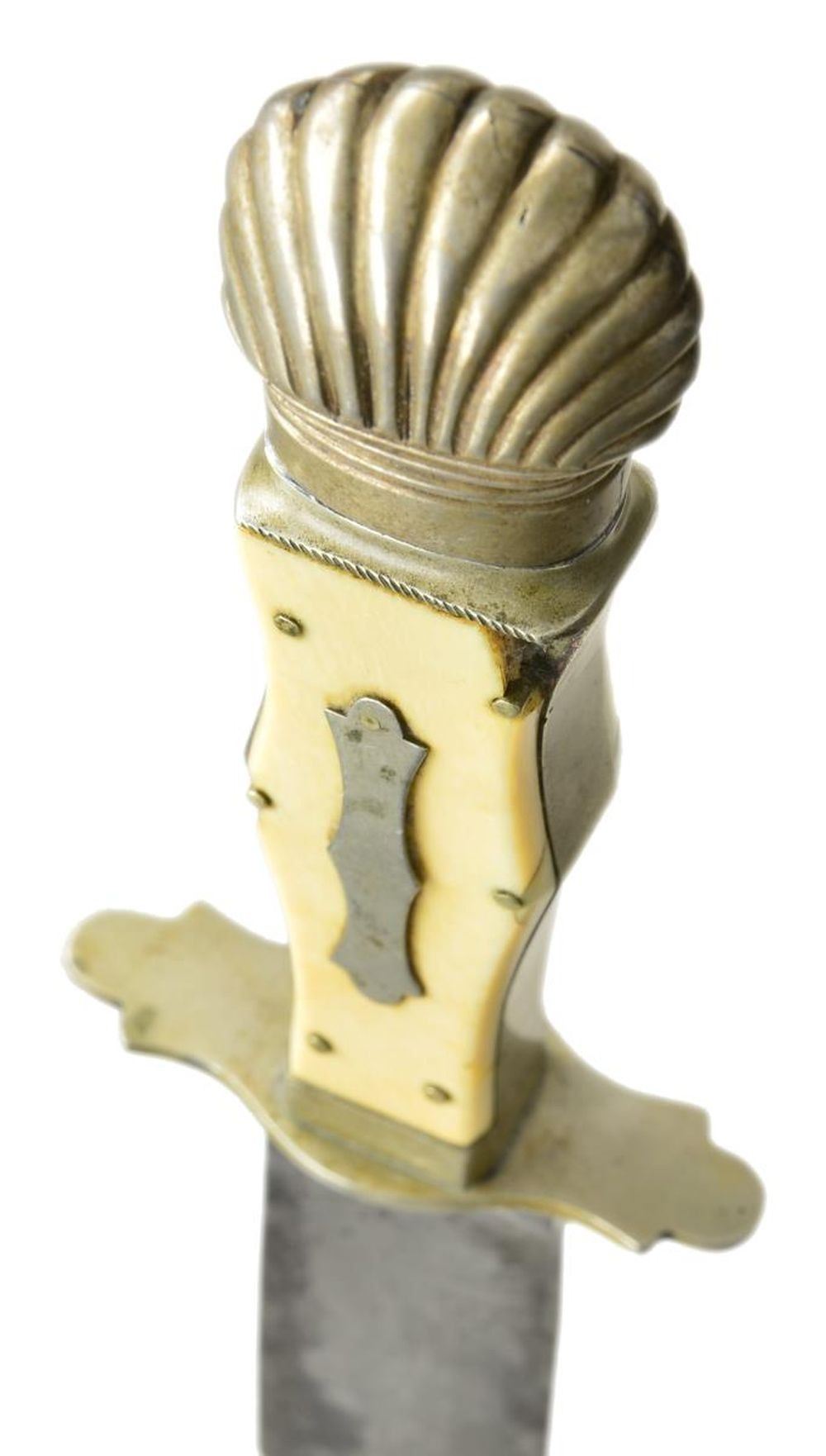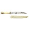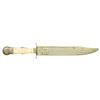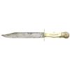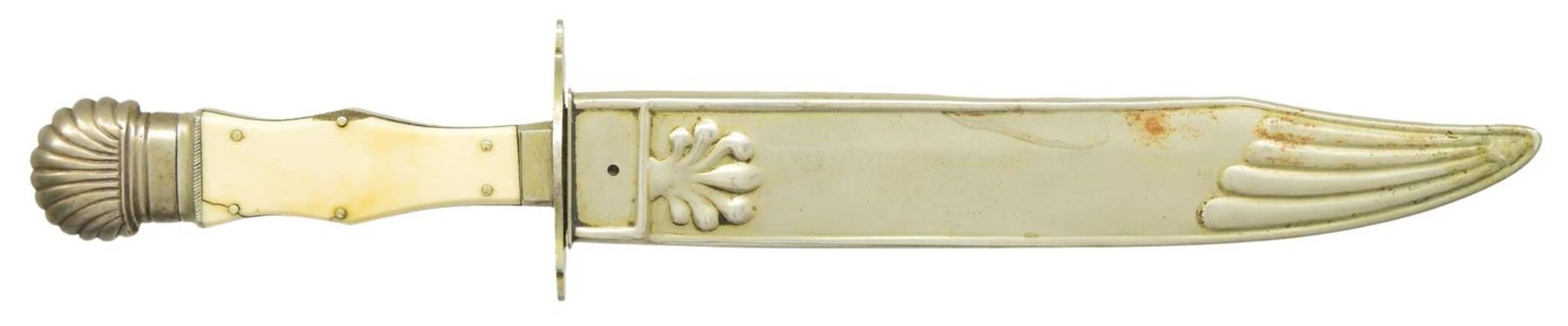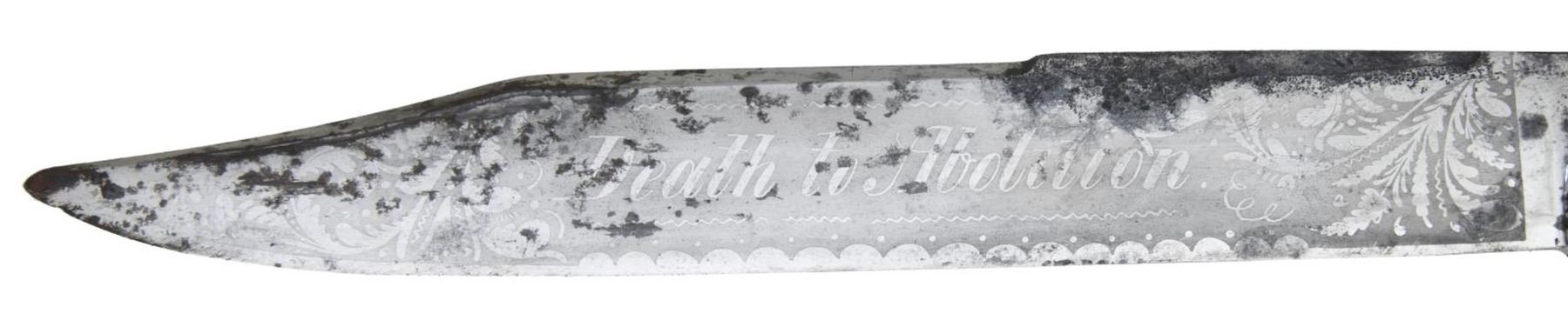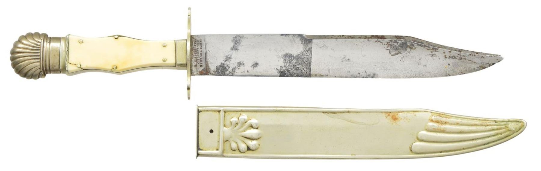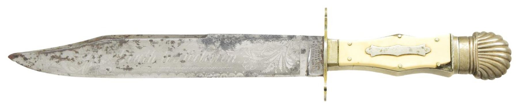 ABOLITION" JAMES ROGERS BOWIE KNIFE. 14" Overall, 9" clip point blade etched in large script panel: "DEATH TO ABOLITION". This earliest political motto found on an American bowie knife infuriated many Northerners as seen in newspapers of the day. The etched sentiment is major reason for the Civil War. Very few "DEATH TO ABOLITION" knives exist with this script style and floral background motif. An 1838 anti slavery broadside is known to exist with a drawing of this same motto on a blade, but with block lettering as seen on most examples. Blade is stamped on ricasso "JAMES ROGERS / CELEBRATED / MAKER. SHEFFIELD", heavy cast German Silver grip with German silver pinned ivory slab grips, German silver escutcheon, sculptured cross guard, and clamshell pommel. Its original and rarely seen German silver, relief repousse sheath fits knife perfectly. Its script motif, fine high-polish blade condition and complete scabbard offer a rare opportunity to add to any exceptional collection. CONDITION: maybe the finest "DEATH TO ABOLITION" bowie of this configuration, only handful known, blade retains 90% original polish and lustrous etching with areas of black staining and pitting, point rounded. The clamshell pommel is replaced, taken from another James Rogers bowie of the era by master conservator Jim Brown. Still this is the best survivor, I am aware. Maker's mark and etched panel are crisp and complete. Ivory slabs sound and well fit with 3 chips by pins and 2 small cracks. The original embossed German silver sheath still retains its chamois lining, which is almost always missing, frog button still attached, minor small dents and stains. (02-19433/JS). $20,000-30,000.