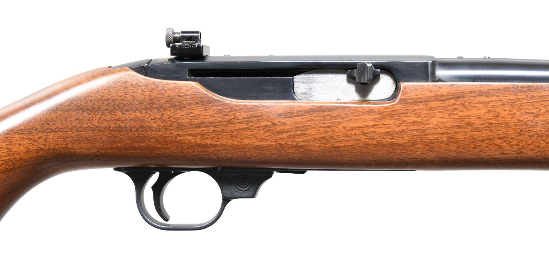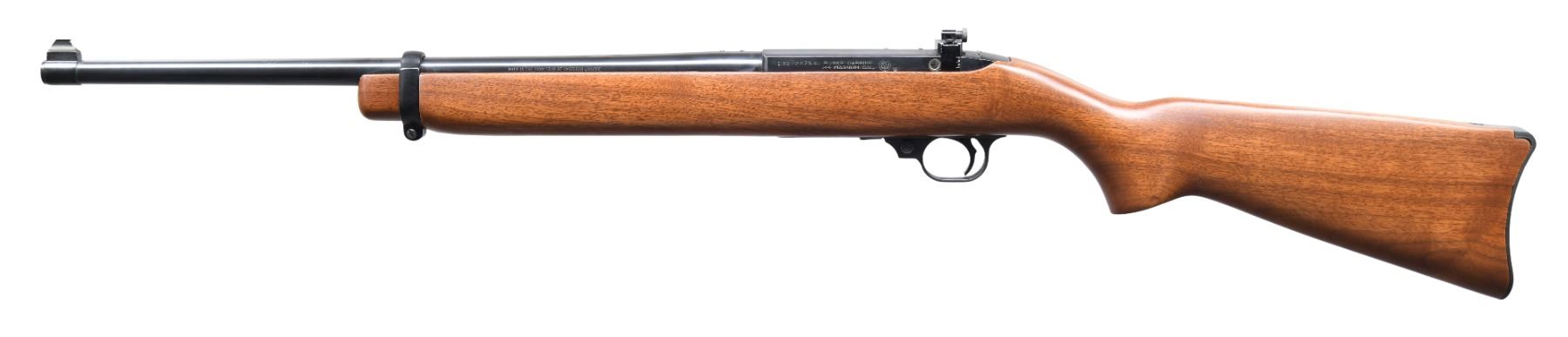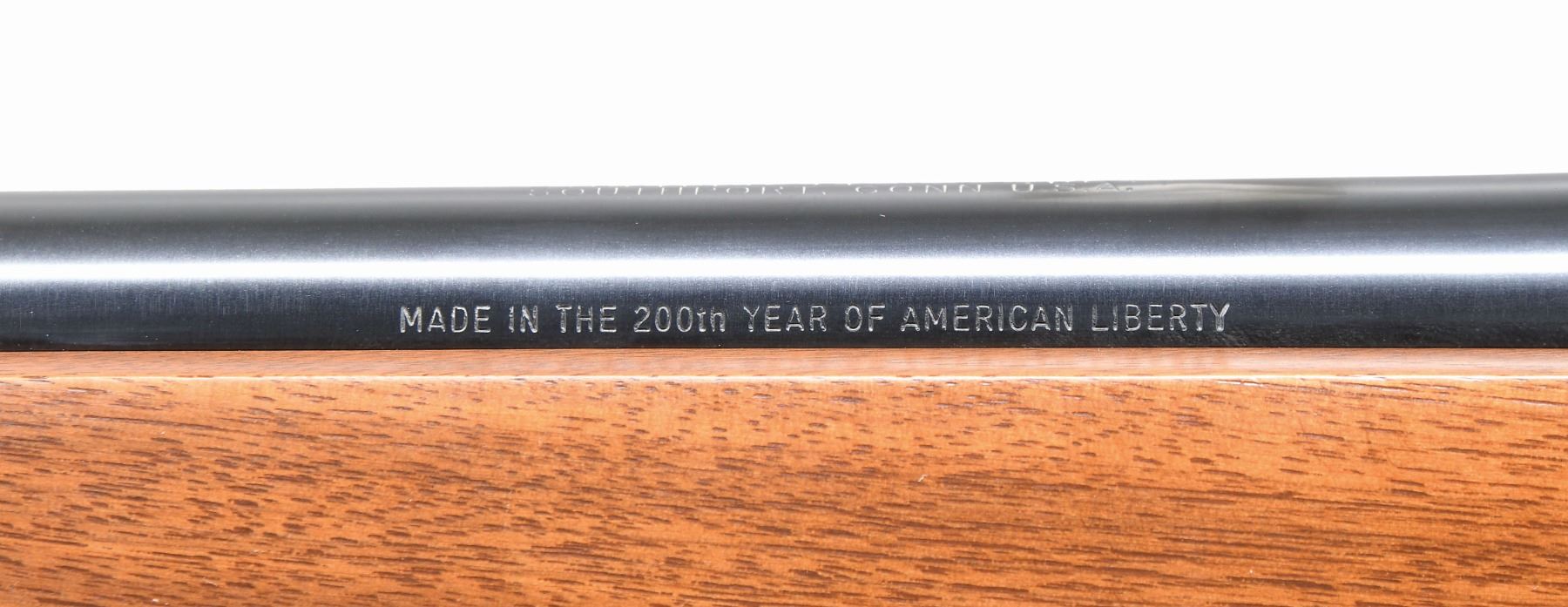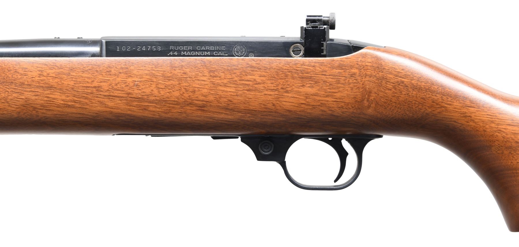 SEMI-AUTO CARBINE. Please note as of 4/9/25 this item description has been updated. Please revisit this description and contact us with any questions. Cal. 44 Mag. S# 102-24758. Bbl. 18 1/2" with brass bead front sight, no dovetail at rear of barrel for folding sight plus receiver machined for receiver sight of Williams 5D configuration. Left midpoint of barrel marked "MADE IN THE 200TH YEAR OF AMERICAN LIBERTY". Mfg. 1976 (1961-1985) and shipped 2010 as sold in a Ruger benefit auction on Gunbroker. Per RENE Reference Guide, one of the rarest of Rugers with only 1 known other than this one! Proper features including: uncheckered walnut carbine stock having square cut forend and black Celcon carbine buttplate, riveted in receiver cartridge guide, button cartridge release in loading area and the rare receiver sight. Very popular and collectable fast handling, brush hunting carbine that weighs less fully loaded than the popular lever action carbine weighs empty! Very special Ruger carbine! UNATTACHED ACCESSORIES: 50th year box (likely for 10/22 Carbine) with factory bar coded label indicating Model 01012 with catalogue designation 44RS plus 4/82 dated manual additionally marked "out of production" in red ink. CONDITION: all aspects near excellent appearing new and unfired. (23-6837/NW). MODERN. $1,500-2,500.