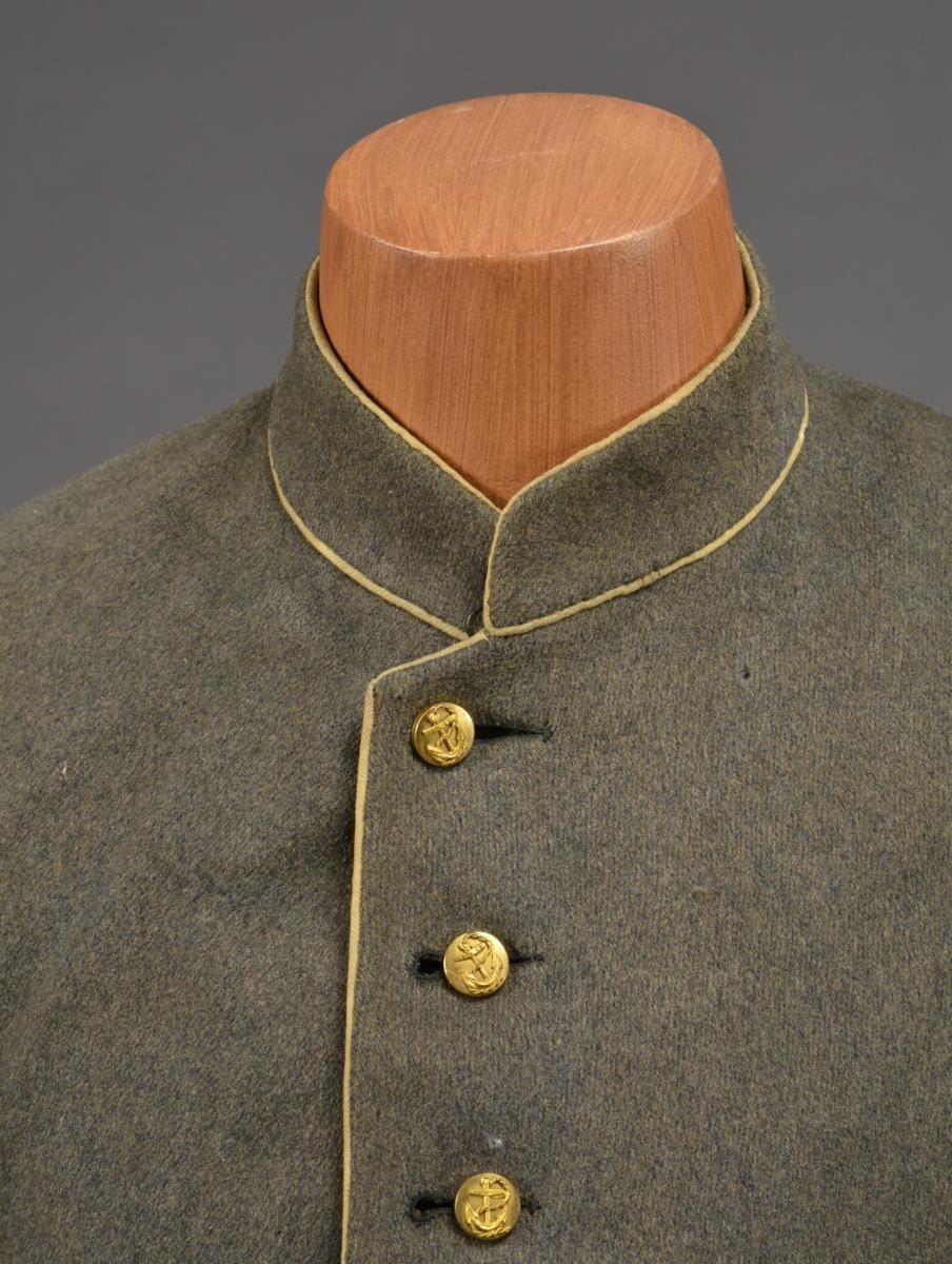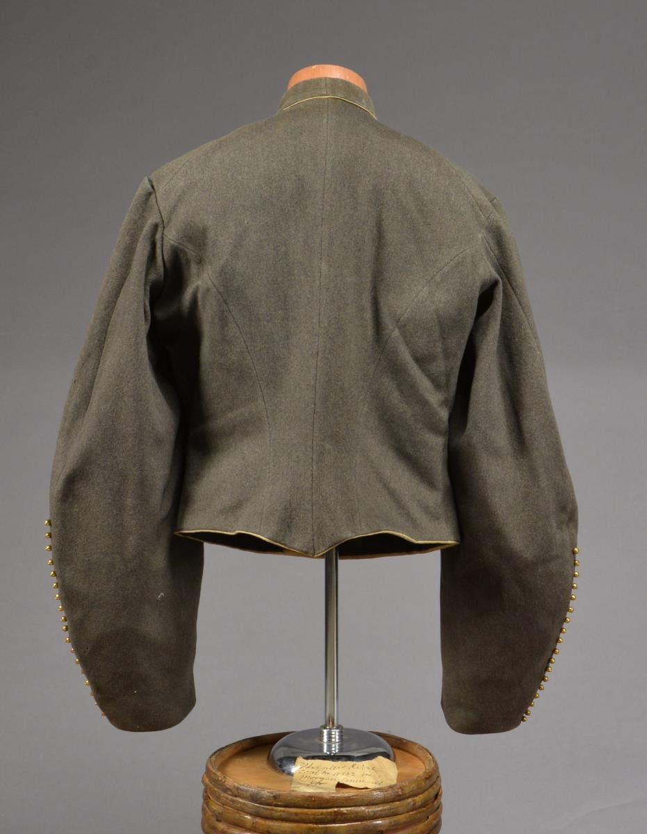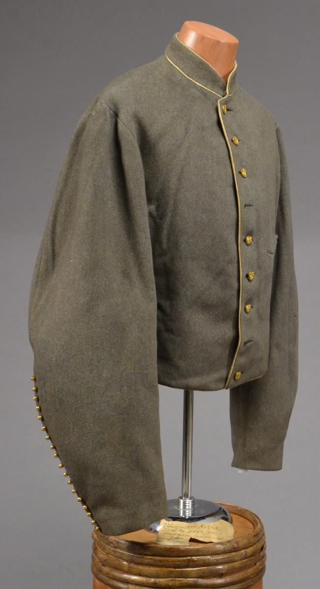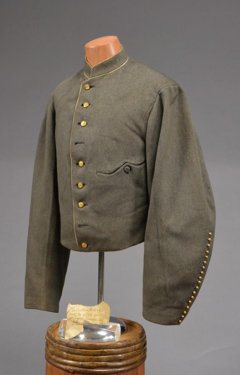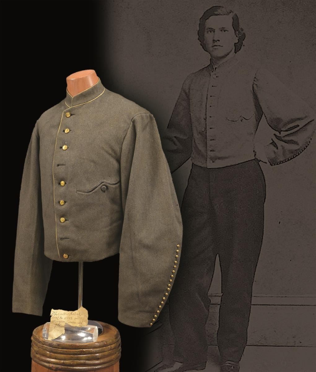 CONFEDERATE SHELL JACKET OF HUNTER B. SWAGER, KENTUCKY CAVALRYMAN IN JOHN HUNT MORGANS COMMAND. Hunter B. Swager (1841-1873) entered service into Company H, 1st Kentucky Infantry & later served in additional units in Virginia & Kentucky throughout the war until captured w/ Morgan’s command in August of 1864. He stayed captive as a POW until his release from Camp Douglas, Illinois March of 1865. Swager’s brother, Charles Moore Swager (1842-1871), served in the 1st & 2nd Kentucky Infantry & was wounded multiple times, captured, escaped upon arrival at Camp Douglas, joined the Confederate Secret Service in Canada & participated in the famed St. Albans raid into Vermont. This jacket is not unique as an absolutely identical jacket is seen in an image of Kentuckian Thomas Bronston Collins of F Company, 11th Kentucky Cavalry (also under Morgans command) at the Kentucky Military History Museum & shown in provenance link. Jacket is extremely well made w/ buff cavalry trim & 18 battle beads (same as the Collins jacket) on both sleeves. The jacket is of high quality tailoring w/ well-padded silk blend lining, 9 button faced w/ antebellum 14mm imported buttons w/ applied fouled anchor. There is a unique scalloped cut pocket on left breast & again, identical to that pictured on the Collins coat. Body of coat is made from fine gray wool. Sleeves are lined w/ a soft tan woven linen. Classic Confederate shell jacket w/ 9" bulbous elbows & 5" cuffs, 32" waist which no doubt fit the 5'7" cavalryman quite well. Rarely are Confederate enlisted uniforms found in such remarkable condition & family provenance. A fragment of a tag found in pocket reads “HUNTERS REBEL / COAT HE WORE IN MORGAN COMMAND FOR...”. Unattached accessories: a sm. file of research accompanies this lot. CONDITION: museum quality, fine overall, well above average & in the top few percent of all surviving identified Civil War textiles. Jacket is original & complete, missing 2 buttons, all 36 battle beads intact. Exterior of coat has 3 very sm. (2-3mm) insect holes, light areas of soiling. Buff trim has faded. Linings are complete w/ only minor separation in one sleeve. Cloth covered button for closure of pocket has been re-sewn. (02-14728/JS). $30,000-40,000.
