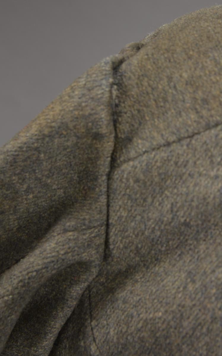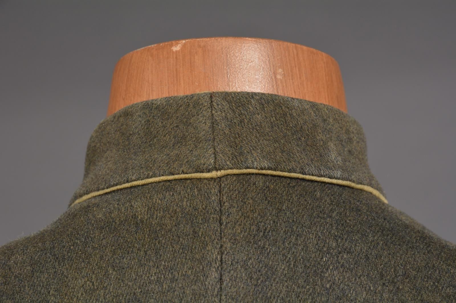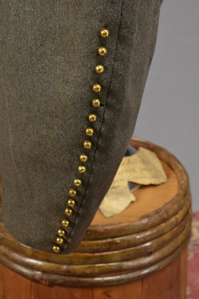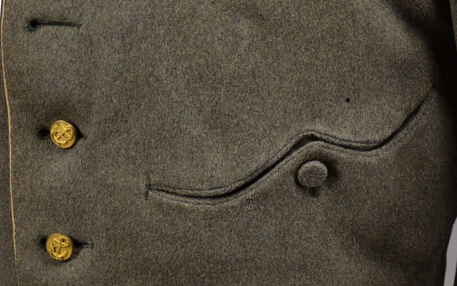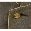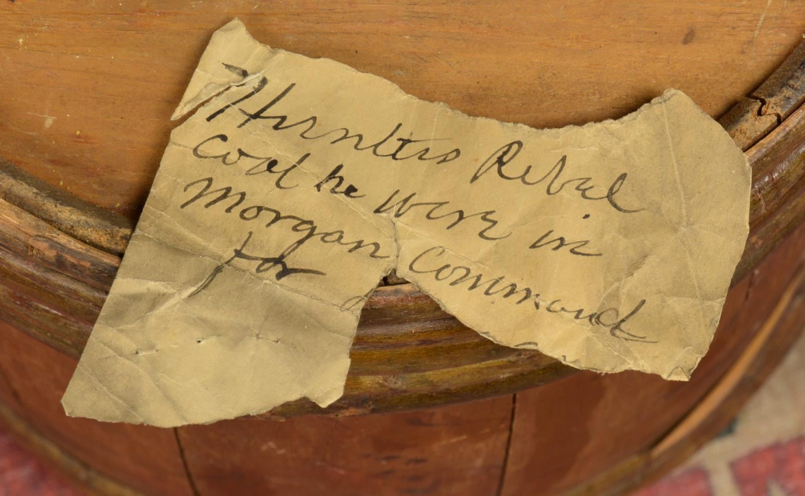 CONFEDERATE SHELL JACKET OF HUNTER B. SWAGER, KENTUCKY CAVALRYMAN IN JOHN HUNT MORGANS COMMAND. Hunter B. Swager (1841-1873) entered service into Company H, 1st Kentucky Infantry & later served in additional units in Virginia & Kentucky throughout the war until captured w/ Morgan’s command in August of 1864. He stayed captive as a POW until his release from Camp Douglas, Illinois March of 1865. Swager’s brother, Charles Moore Swager (1842-1871), served in the 1st & 2nd Kentucky Infantry & was wounded multiple times, captured, escaped upon arrival at Camp Douglas, joined the Confederate Secret Service in Canada & participated in the famed St. Albans raid into Vermont. This jacket is not unique as an absolutely identical jacket is seen in an image of Kentuckian Thomas Bronston Collins of F Company, 11th Kentucky Cavalry (also under Morgans command) at the Kentucky Military History Museum & shown in provenance link. Jacket is extremely well made w/ buff cavalry trim & 18 battle beads (same as the Collins jacket) on both sleeves. The jacket is of high quality tailoring w/ well-padded silk blend lining, 9 button faced w/ antebellum 14mm imported buttons w/ applied fouled anchor. There is a unique scalloped cut pocket on left breast & again, identical to that pictured on the Collins coat. Body of coat is made from fine gray wool. Sleeves are lined w/ a soft tan woven linen. Classic Confederate shell jacket w/ 9" bulbous elbows & 5" cuffs, 32" waist which no doubt fit the 5'7" cavalryman quite well. Rarely are Confederate enlisted uniforms found in such remarkable condition & family provenance. A fragment of a tag found in pocket reads “HUNTERS REBEL / COAT HE WORE IN MORGAN COMMAND FOR...”. Unattached accessories: a sm. file of research accompanies this lot. CONDITION: museum quality, fine overall, well above average & in the top few percent of all surviving identified Civil War textiles. Jacket is original & complete, missing 2 buttons, all 36 battle beads intact. Exterior of coat has 3 very sm. (2-3mm) insect holes, light areas of soiling. Buff trim has faded. Linings are complete w/ only minor separation in one sleeve. Cloth covered button for closure of pocket has been re-sewn. (02-14728/JS). $30,000-40,000.