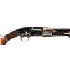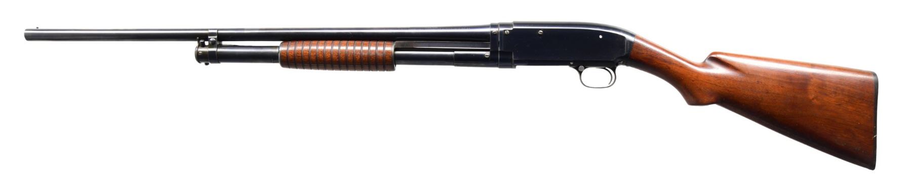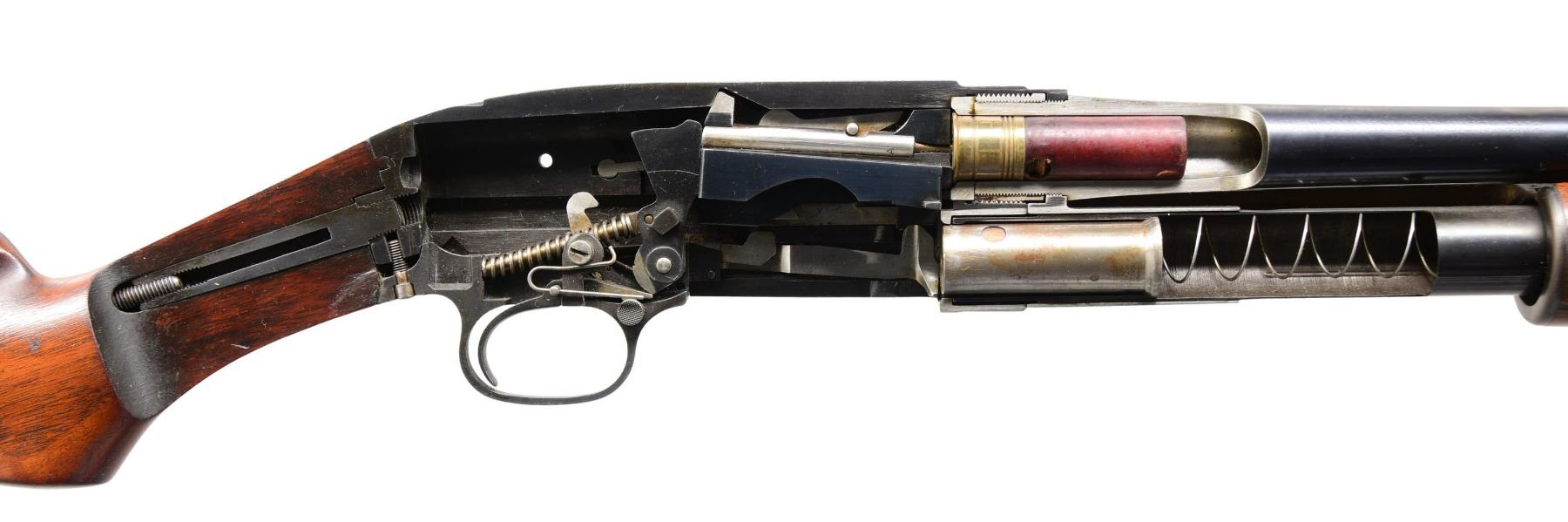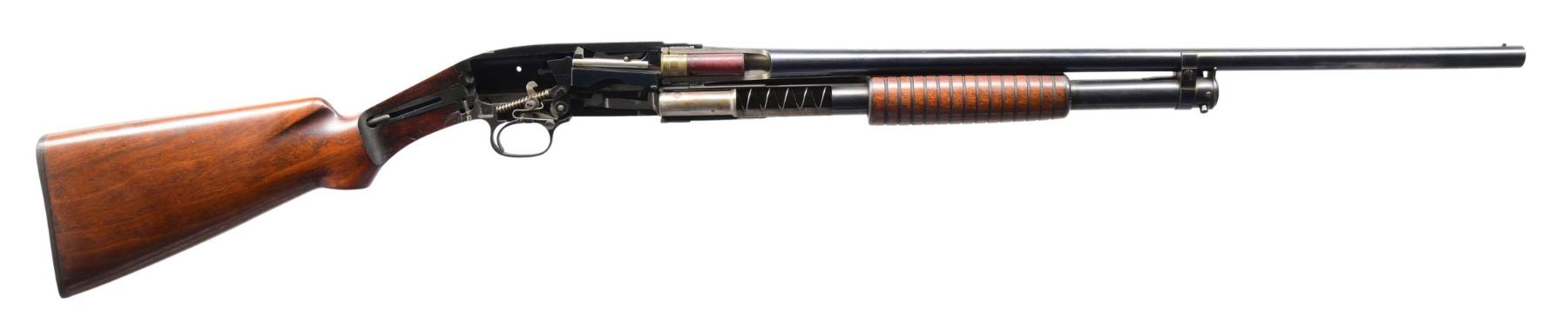 PUMP SHOTGUN. Cal. 20 ga. S# A. Bbl. 25" plain of nickel steel. Built as a demonstration model to show the working parts of Winchester's new pump shotgun & to promote sales. This is believed to be 1 of only 2 produced. Action, chamber, bbl., mag. tube & wrist of stock are cutaway to expose an inner view. CONDITION: very fine, retaining over 98% blue. Stock shows mild age related wear & handling marks. PROVENANCE: The estate collection of Don "Duck" Combs. (24-2524/DS). CURIO. $7,000-10,000.