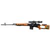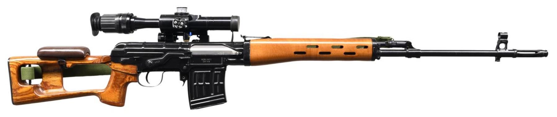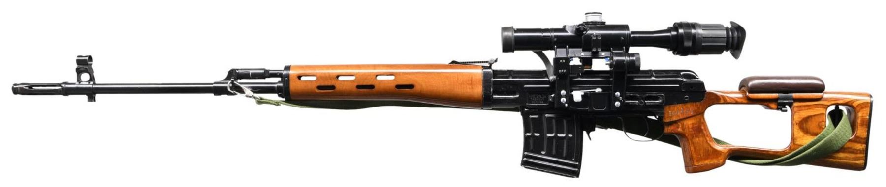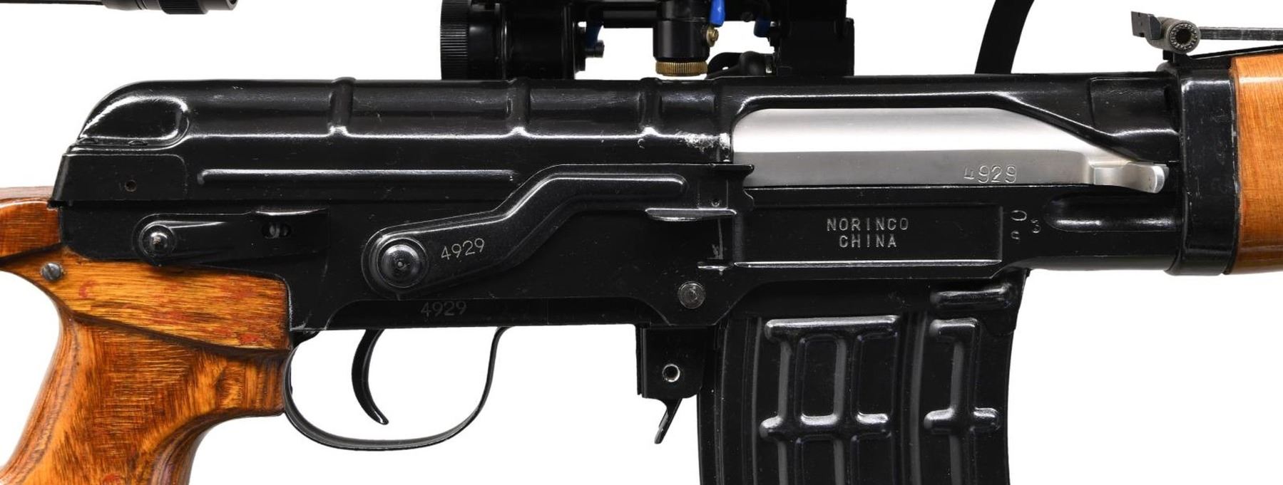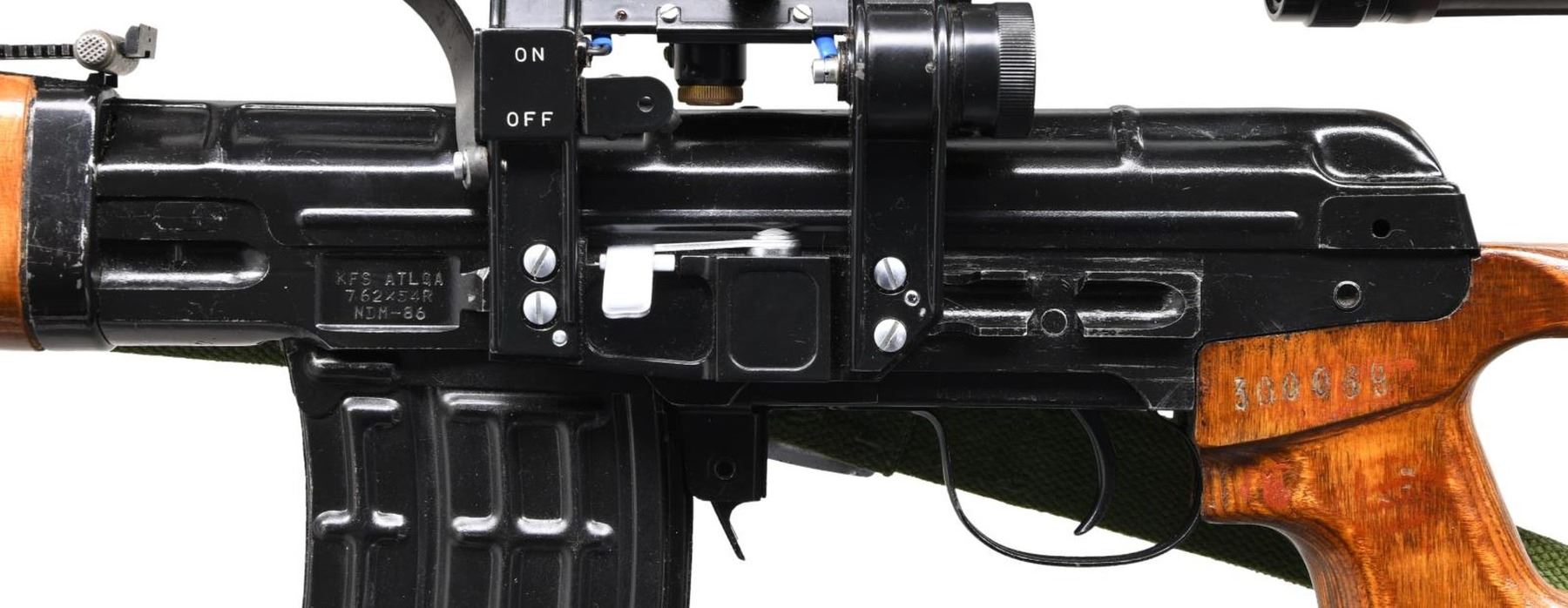 SEMI-AUTOMATIC SNIPER RIFLE. Cal. 7.62x54R. S# 604929. Bbl. 24" NDM-86 semi-automatic rifle mfg. in China by Norinco and imported by KFS of Atlanta, GA. The left side of the milled receiver is marked "KFS ATL GA / 7.62x54R/ NDM-86", with "NORINCO/ CHINA" marked on the right. Metal components exhibit a black enamel finish overall. Furniture is comprised of a laminated wood thumbhole buttstock (with removable cheek rest) and a 2-piece ventilated laminated wood handguard. Receiver side rail is mounted with a Type JJJ 4x24 scope. All numbers are matching and include the receiver, receiver cover, bolt carrier, bolt, trigger assembly housing, selector lever, bbl. gas piston, as well as the handguards. Underside of rear sight leaf exhibits a matching S# via an electro-penciled inscription. Stock is appropriately numbered and matching to the scope. MAGS: 2 10-rd. UNATTACHED ACCESSORIES: generic soft case containing 1 spare mag. and bayonet with scabbard. CONDITION: metal components retain the majority of their original factory black enamel finish, exhibiting some scattered spots of flaking with a few small areas of concentrated wear. Brilliant mirror bore, exhibiting sharp and well defined rifling throughout. Wood furniture shows some light superficial marks from handling and storage, but is otherwise very good overall. Scope retains a clear and sharp optic. Bayonet is excellent overall. A nice example of a Chinese variant of the iconic SVD rifle, that is seldom seen outside of private collections. PROVENANCE: From the Working Reference Collection of Military Arms Instructor, Master Sergeant Vincent Pestilli. (23-7510/MLW). MODERN. $5,000-8,000.