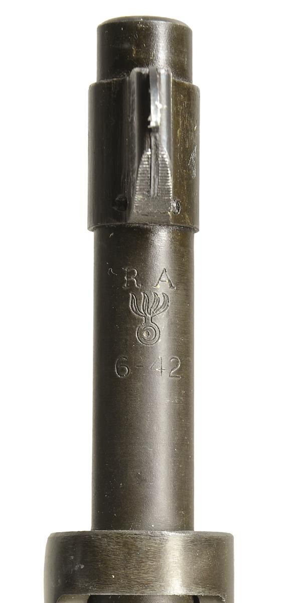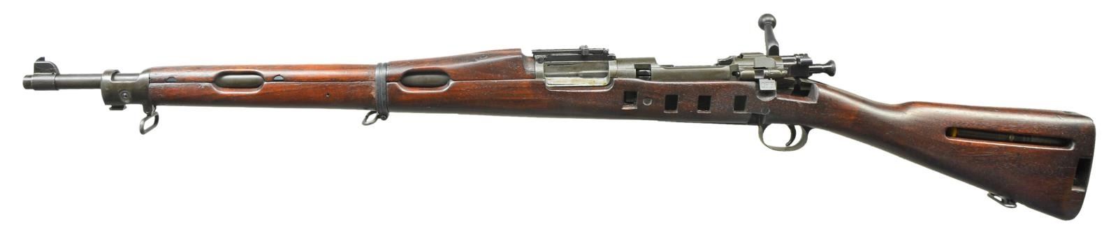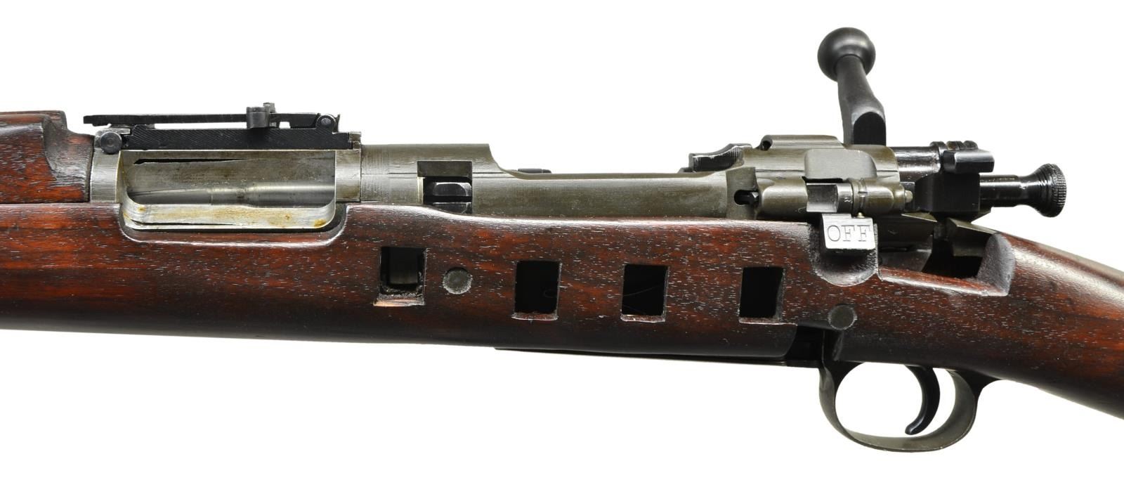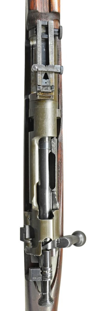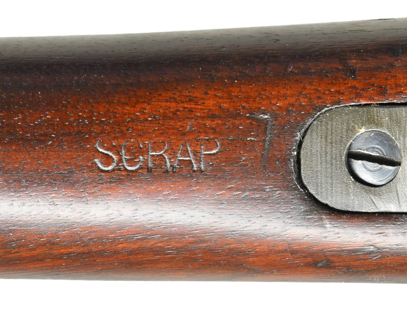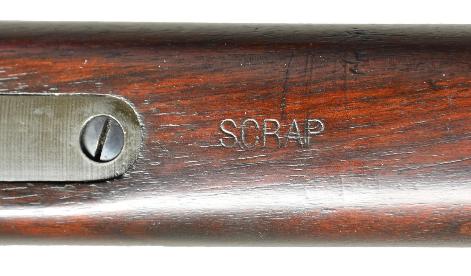 CUTAWAY BOLT ACTION RIFLE. Cal. 30-06. NSN. Bbl. 24". These rare rifles were sectionalized by the Rem. factory to show the inner workings of the 1903 rifles they were producing. The rifles were used for training & demonstration purposes. There were very few produced & most were scrapped or given away post war. Interestingly the rifles appear normal when viewed from the right side except for the extractor. The sectionalization was done on the left side & shows both operational & assembly features. These rifles were reportedly made from out of spec., rejected parts but were nicely finished. Their receiver markings were removed but interestingly the bbl. is marked normally w/ "RA" flaming bomb & 6-42. The flaming bomb has the center punched proof mark. The only other parts markings are the sm. "R" on the bolt sight parts, etc. Stock marked at the bottom of each end, trigger guard w/ "SCRAP". Rifle has all milled furniture except for the fine checkered stamped buttplate. Walnut stock & handguard, straight grip stock mfg. w/ 2 recoil bolts. Buttstock marked on right side w/ "CW" in flaming bomb. UNATTACHED ACCESSORIES: 2 FA 54 head stamped dummy cartridges. CONDITION: stock set has very pleasing appearance w/ light wear & scattered handling marks. Has notable abrasion forward of lower band. Metal has mix of wartime gray parkerizing & blue finishes w/ light high point wear. Bore is in near excellent condition. PROVENANCE: Estate Collection of Kenneth Horn (Grandson of JC Higgins). (22-389/RW). CURIO. $1,500-2,250.