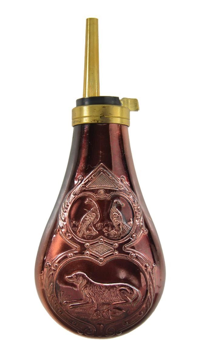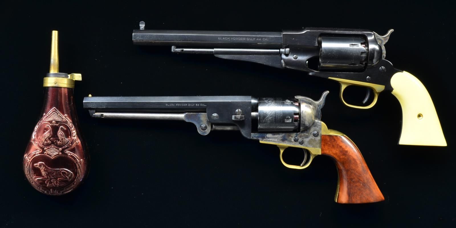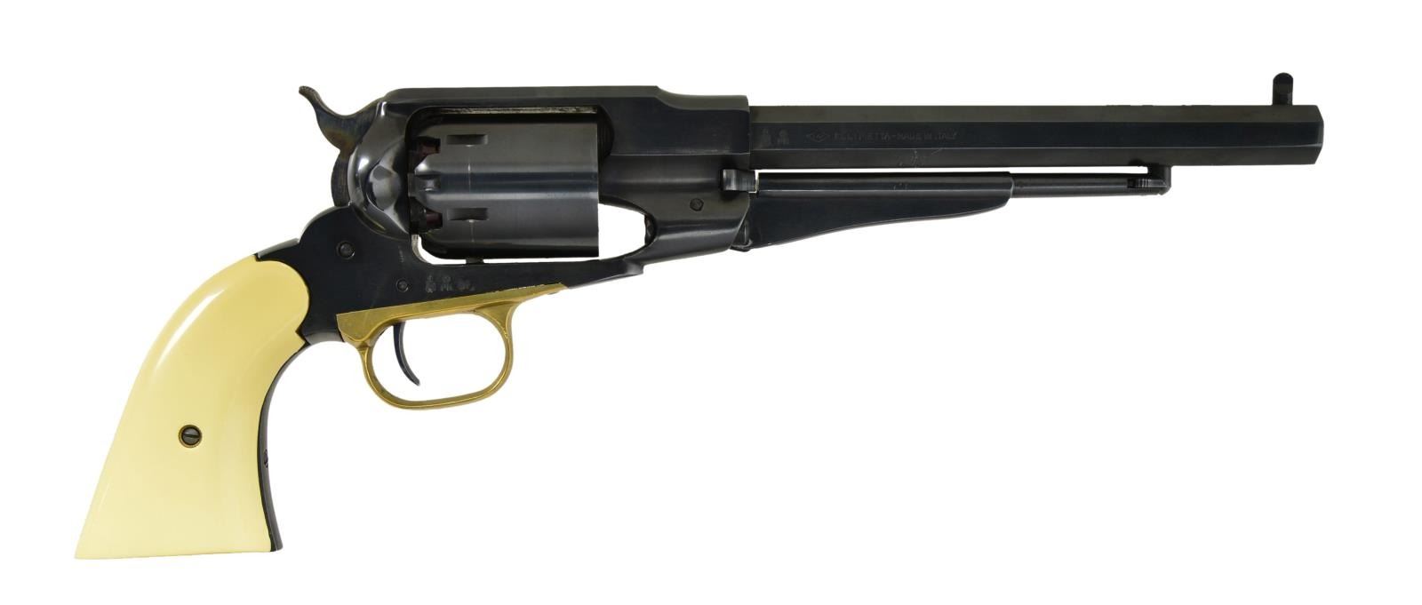 1) 1858 NEW MODEL ARMY. Cal. 44. S# 201485. Repro. of Remington 1858 NM Army w/ 2001 Italian proofs. Bbl. 8" oct. 6 Shot cyl. Blue finish w/ case colored hammer. Brass trigger guard. 2 Piece synthetic ivory grips. UNATTACHED ACCESSORIES: good lg. powder flask w/ flaking finish. CONDITION: near excellent overall appearance w/ area of scratches right side of bbl., minor handling marks & cyl. turn line. Nipples have plastic covers. Very good bore w/ strong rifling. (01-21014/MD).