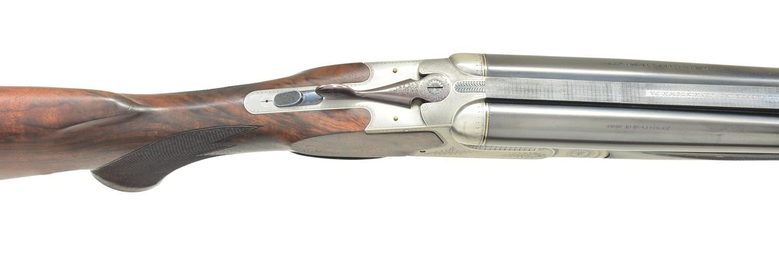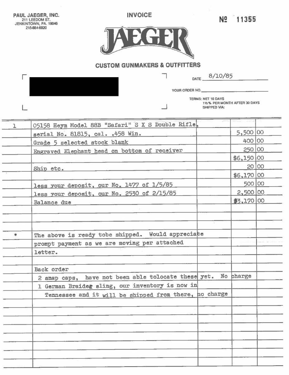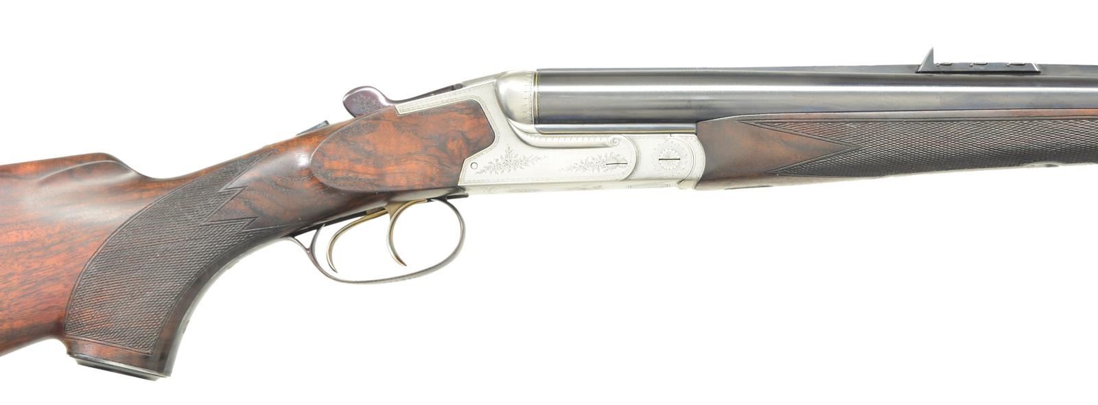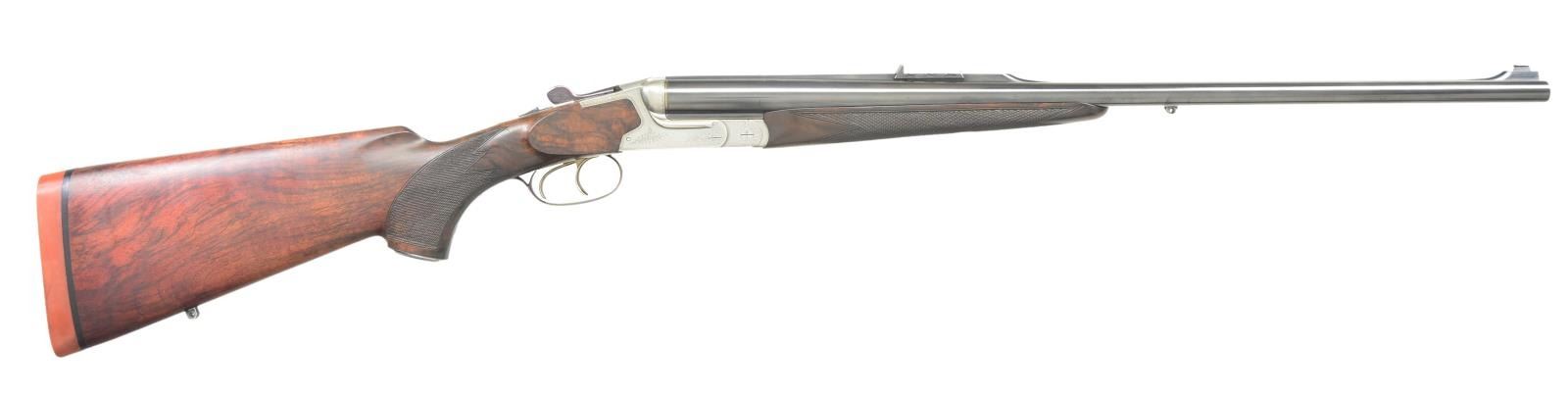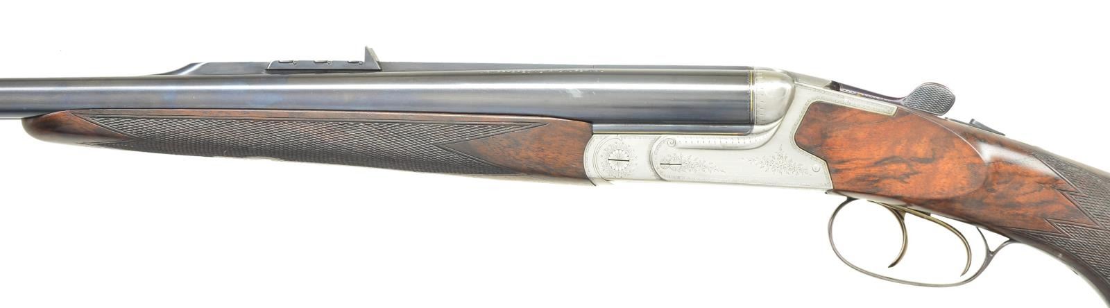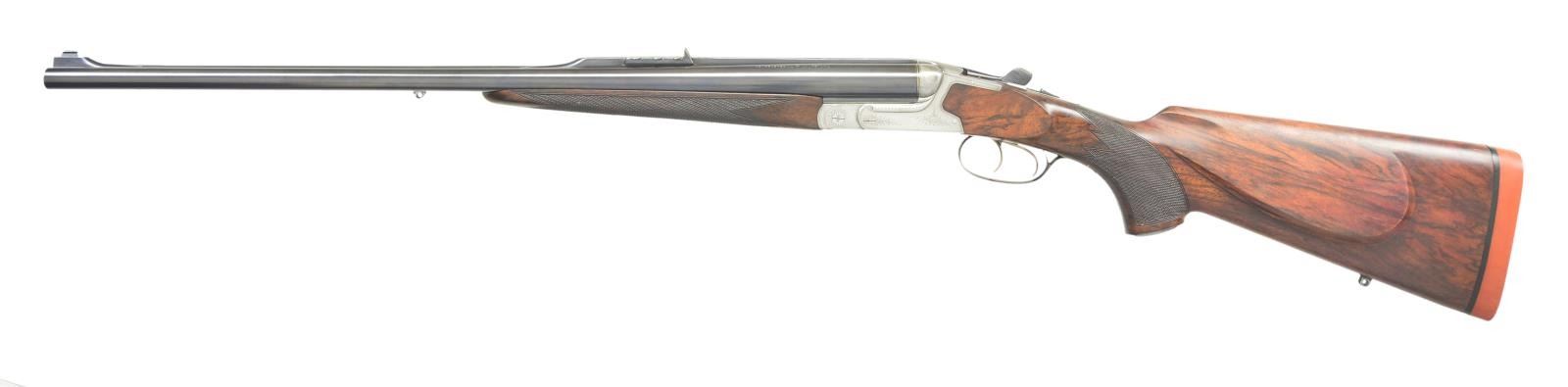 DOUBLE RIFLE WITH TRAVEL CASE. Cal. 458 Win. Mag. S# 81815. The 25" shoe lump barrels are fitted with matted quarter rib holding one standing, three folding leaf rear sight and matching front ramp holding gold bead. Unmatted portion of rib is engraved "PAUL JAEGER, INC., JENKINTOWN, PA.". Tops of barrels are marked with steel type and "MADE IN W-GERMANY". Thin gold bands are inlaid around breech ends. Barrel flats are stamped with 1985 German nitro proofs, caliber and S#. A sling eye is soldered to bottom rib. Extractors are fitted with dual pins to engage rimless case, to ensure reliable extraction. Coin finished, nicely filed boxlock action features non automatic safety, pin cocking indicators on top, crossbolt third fastener, small reinforce to frame and double triggers (front articulated). Action is engraved with attractively hand cut sprays of scroll within small scroll borders. Bottom of action and trigger plate has extremely fine rendering of a bull elephant done in Bulino style. Trigger plate is also engraved "FRIEDRICH WILH. HEYM" on banner. Matching top lever and trigger guard are blued. Trigger guard tang extends to steel grip cap. Pistol grip buttstock of very nicely marbled European walnut measures 15" over red solid "Old English" pad. Stock features swept right hand cheekpiece and multi point pattern checkering at grip. A sling eye is on toeline. Matching semi beavertail ejector forend with Deeley release, has on/off switch on bottom to disable ejectors when needed. MEASUREMENTS: STOCK: DAH: approx. 3". DAC: approx. 1 5/8". CAST: neutral. LOP: 15". WEIGHT: 9 lb. 13 oz. UNATTACHED ACCESSORIES: rifle is housed in aluminum travel case lined in black foam, which has tan canvas leather trimmed outer cover marked "Dunns" on leather tag. Original invoice from Jaeger. Appraisal 1994 by Paul Jaeger. Appraisal 2004 by NECG for $19,995.00. Heym booklet with target (4 documents total). CONDITION: fine with evidence of some light field use perhaps one or two safaris. Barrel blue showing some high edge wear, action showing some light cleaning. Stock has some sanding marks on right side of butt but otherwise stocks retains nearly all of their original oil finish. Bores are bright and shiny. Action is tight, ejectors are strong and in time. Switch mechanism works well. A fine safari rifle in a caliber widely available throughout Africa. The current production of this rifle called the "Safari" model retails for over $22,000. (23-613/MGM). MODERN. $10,000-15,000.