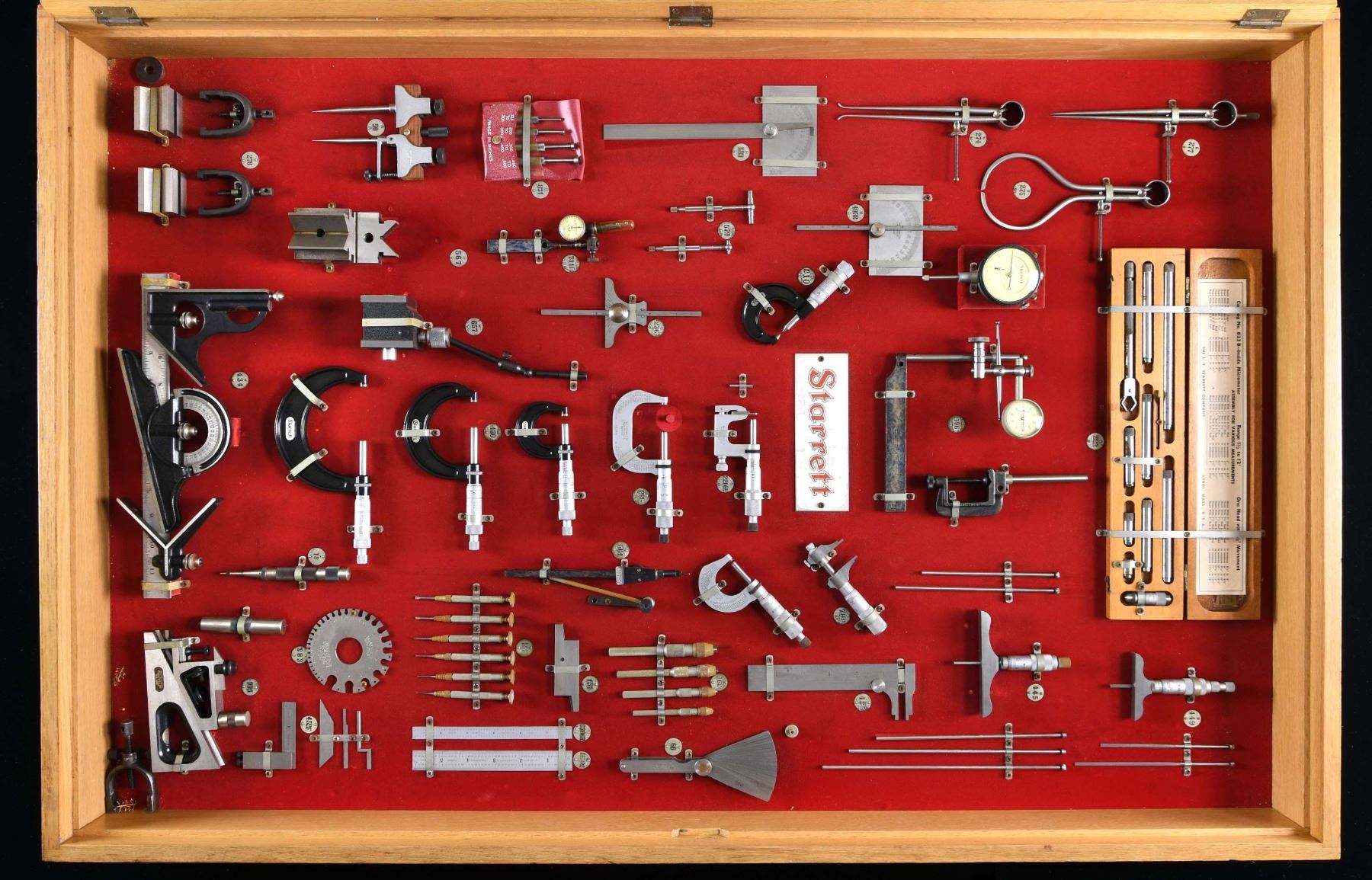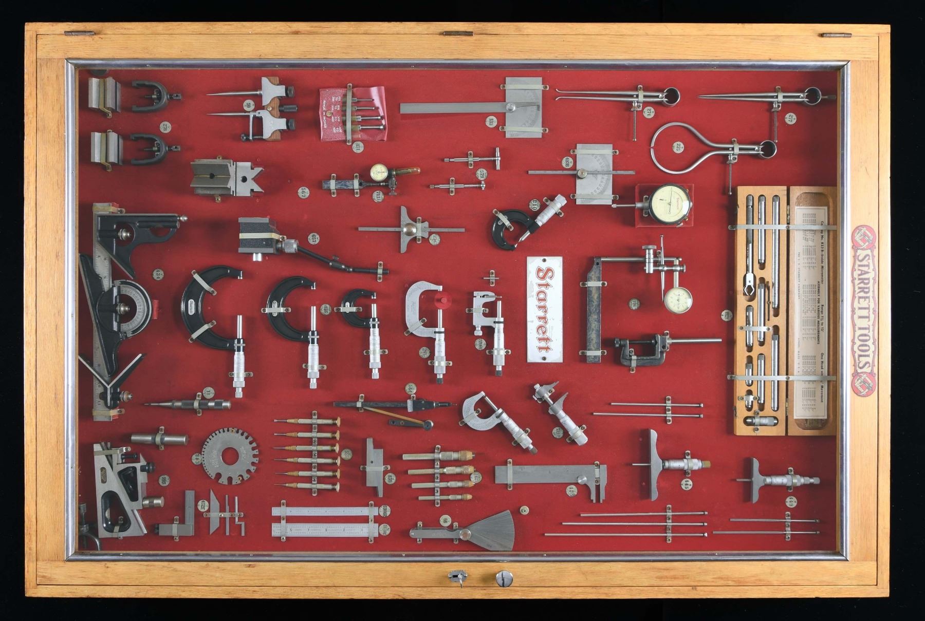 DISPLAY CASE. This immense case measures 45 5/8" x 30". It appears to be made of finely milled oak with a glass front and a large 9" decal on the front in silver and red that reads "STARRETT TOOLS" with decorative circles on each end. There are over 75 individual tools and tool parts housed in this red-backed cabinet. There are a large number of micrometers along with a huge variety of measurement and calibration tools. Individually, many of these tools sell for hundreds of dollars. It is difficult to convey the rarity of this monumental display, likely originally housed in the Starrett corporate offices. CONDITION: the case shows very minor handling wear, with the finish and overall appearance remaining as it did at the Starrett factory in Athol, MA. The tools themselves are in superb condition and have quite likely never been used or touched since they were mounted in this cabinet as they came off the factory floor. A wonderful once in a lifetime opportunity for the Starrett collector. PROVENANCE: from the renowned collection of quality sporting arms from Lewis Drake together with inventory of Lewis Drake Associates. (02-23540/BF). $1,500-2,000.