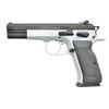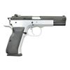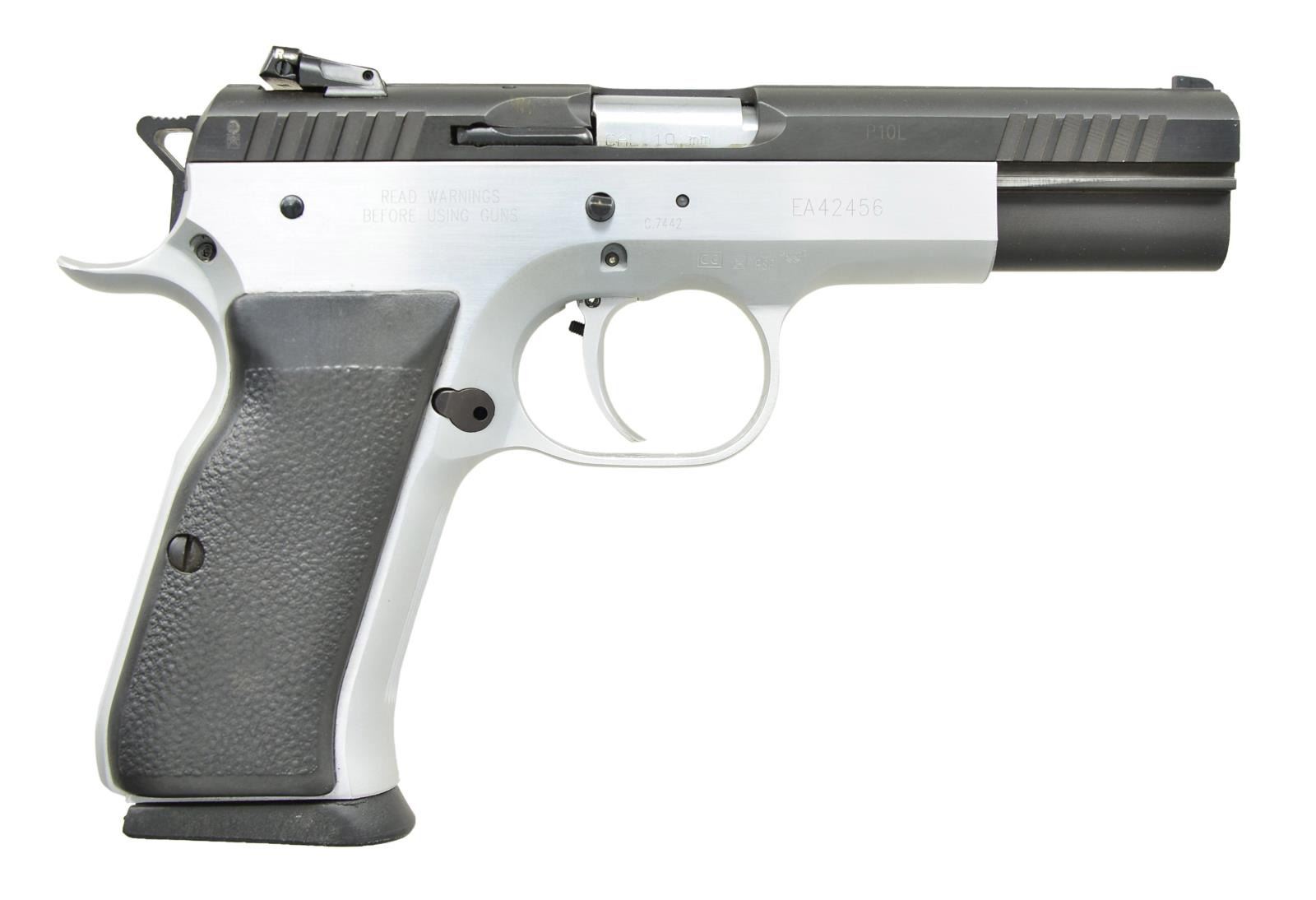 Cal. 10mm. S# EA42456. Bbl. 4.75". 2-Tone steel single action, match pistol. Matte blue finish, front & rear serrated slide w/ flat top. Engraved "Match" on left side. Front blade sight w/ adjustable rear sight. Left side controls. Skeletonized hammer w/ serrated spur. serrated, extended slide release & thumb safety. Checkered, extended mag release. 2 Piece textured rubber grips. Natural stainless steel frame, satin finish sides, bead blasted on bottom, front & rear. Serrated front & rear strap. Full length guide rod. MAGS: 4 steel 14 rd. UNATTACHED ACCESSORIES: lockable factory foam lined, fitted case. Cleaning kit, paperwork, lock & spare springs. CONDITION: all outward finish free from obvious blemishing. Internals illustrate some thinning on parts w/ mechanical intervention which happens almost immediately. Bright bore w/ strong rifling. Fire control mechanism appears to function correctly when cycled by hand. (22-3346/JZ). MODERN. $500-700.