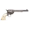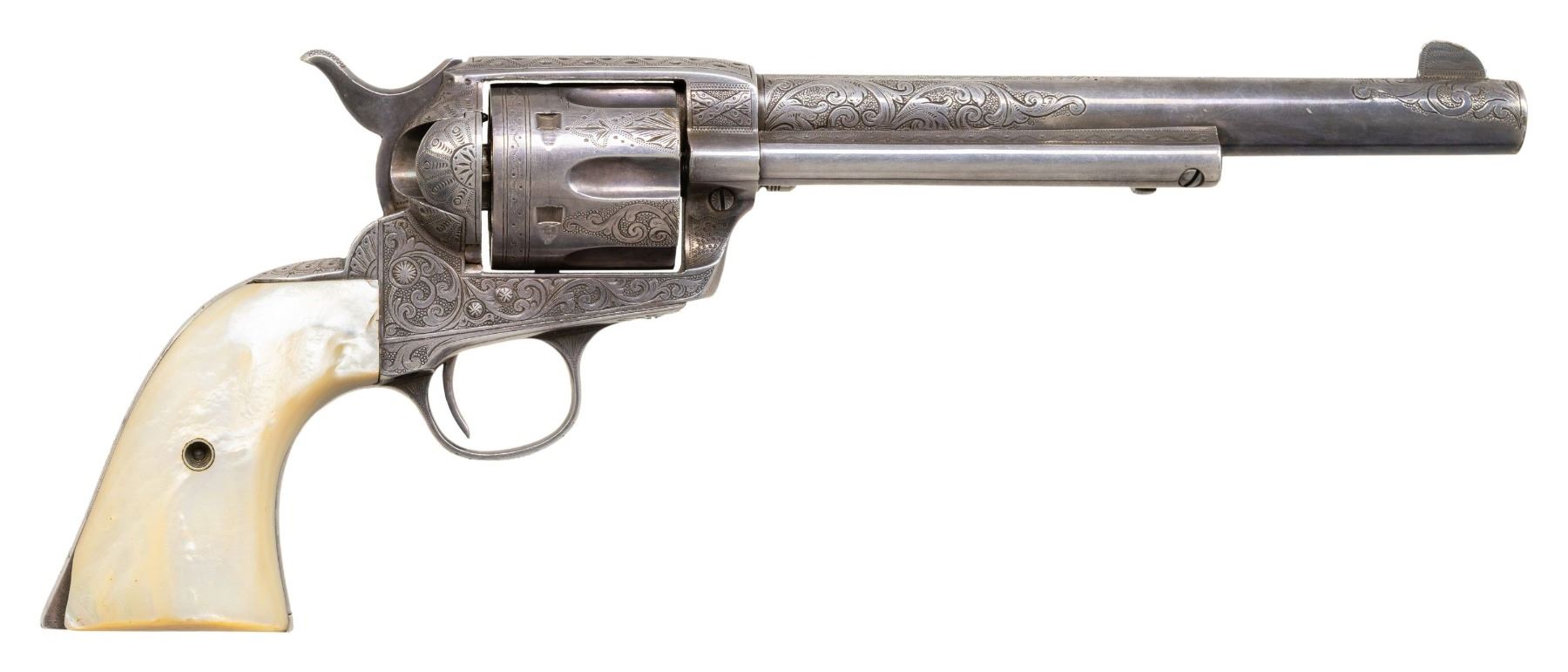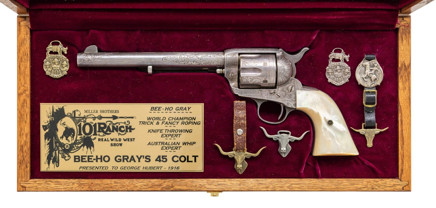 PERIOD SILVER PLATING & INSCRIPTION FROM BEE HO-GRAY TO GEORGE HUBERT. Cal. 45 Colt. S# 317105. Mfg. 1911. Bbl. 7 1/2" with blade front sight. Bee-Ho Gray (1885-1951). Was an accomplished trick roper who performed in circuses, rodeos and a multitude of Wild west shows including the Miller Brothers / 101 Ranch Real Wild West Show. Born Emberry Cannon Gray in Leon, Chickasaw Nation, Indian Territory, OK, Gray was raised amongst the Apache, Comanche, and Kiowa tribes and would eventually take on the name Bee-Ho. Bee Ho Gray joined the Miller Brothers / 101 Ranch show and traveled with them from 1907-1916 and again from 1925-1931. It should be noted that this revolver was shipped to Chicago on March 30, 1911, Bee-Ho Gray travelled with the show and performed in Chicago just over 3 months later on July 8, 1911. Other notable performers include Tom Mix & "Buffalo" Bill Cody. Revolver appears to be factory engraved in the complex style of Cuno Helfricht. Frame & bbl. feature foliate scroll over a punch dot background. Recoil shield & loading gate have the Helfricht style sunburst pattern. In between cyl. flutes alternate notes of scroll and fancy finial patterns. Found throughout are zig zag, punch dot, straight & wavy line borders. Backstrap professionally inscribed (non factory) :1916 Fron Bee-Ho Gray / To George Hubert". Revolver is fully silver plated, tarnish would indicate that this was likely done at the time of inscription. It is unknown who George Hulbert was but date of inscription coincides with Gray's final year of his first stint with the Miller Brothers / 101 Ranch show. Revolver is stocked with fancy factory 2 piece mother of pearl grips. Matching numbers on frame, trigger guard frame, cyl. & butt. UNATTACHED ACCESSORIES: excerpt from Colt factory letter stating the following: "Serial Number: 317105 / Caliber: 45/c / Barrel Length: 7 1/2" / Finish: Nickel / Type of Stocks: Pearl / Factory Engraved: Yes / Shipped To: Von Lengerke & Antoine / Address: Chicago, Illinois / Date of Shipment: March 30, 1911 / Number of Same Type Guns in Shipment: 1". Custom glass topped red velour shadow lined oak display case containing commemorative plaque and an assortment of Western themed souvenirs. Case is housed in a white cardboard shipping carton. CONDITION: metal retains 98% of its period silver plating with small spot of flaked finish at lower right of muzzle. Silver has acquired a handsome darkening tarnish with age. Sharp edges are softened slightly. Grips are very good with small dings and scratches. Right panel has small loss at heel. Good bore is generally bright with scattered areas of fine pitting. An overall attractive Wild West Colt SAA. PROVENANCE: From the Buckstix Collection. (25-6319/BH). CURIO. $18,000-27,000.