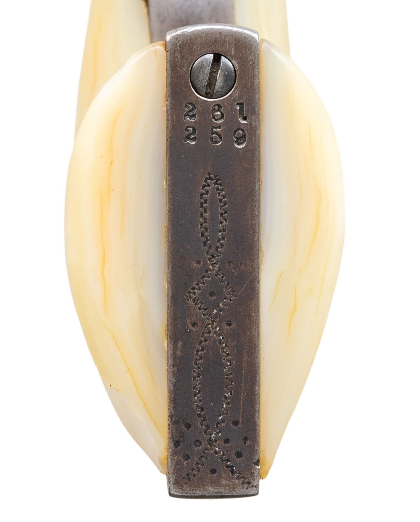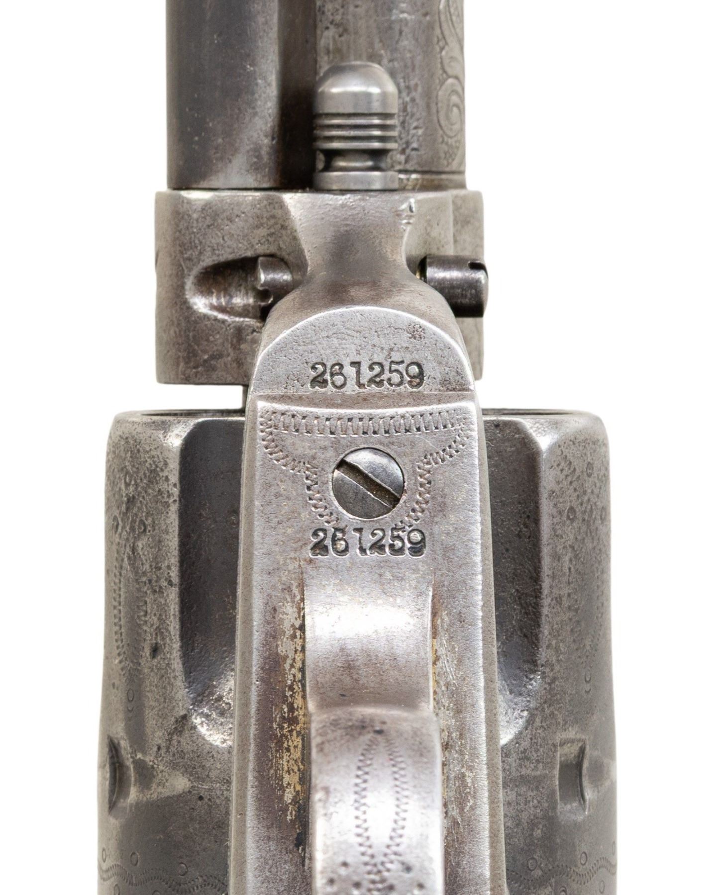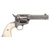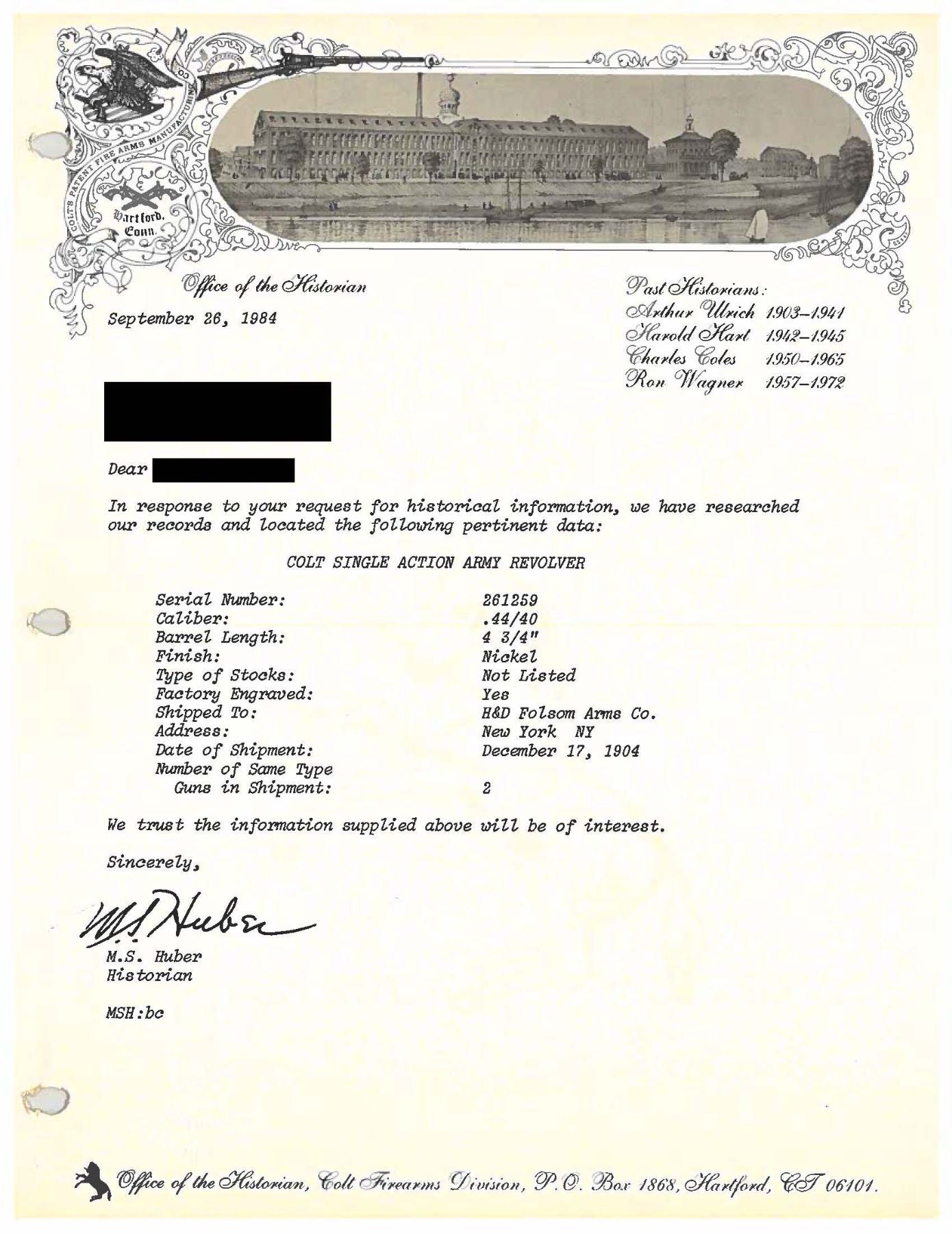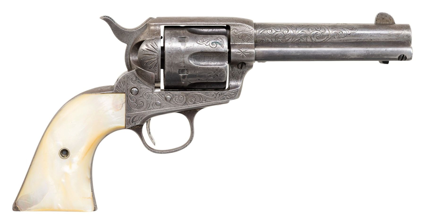 SHOOTER SAA REVOLVER WITH FACTORY LETTER. Cal. 44-40. S# 261259. Bbl. 4 3/4" with blade front sight. Revolver appears to be done in the pattern of Colt Factory engraver Cuno Helfrict. Frame features foliate scroll engraving over punch dot background with wavy line notes ahead of cyl. Recoil shield and loading gate have sunburst pattern. Wavy line zigzag pattern intersecting punch dot engraving encompasses rear of cyl. as well as full length of ejector housing flat. In between cyl. flutes have alternating foliate scroll & zigzag engraving, also indicative of Helfricht. Left side of bbl. roll stamped "COLT FRONTIER SIX SHOOTER" inside banner surrounded by foliate scroll. Revolver is stocked with 2 piece mother of pearl grips. UNATTACHED ACCESSORIES: Colt factory letter stating the following: Serial Number: 261259 / Caliber: .44/40 / Barrel Length: 4 3/4" / Finish: Nickel / Type of Stocks: Not Listed / Factory Engraved: Yes / Shipped to: H&D Folsom Arms Co. / Address: New York NY / Date of Shipment: December 17, 1904 / Number of Same Type Guns in Shipment: 3". CONDITION: metal is overall gray with wear & pitting; notable at muzzle end of bbl. & front sight. Grips are good with small loss on left heel and large thin surface loss at right heel. Bore is fair to good with sharp rifling amidst areas of oxidation. Mechanically sound. (25-6133/BH). CURIO. $14,000-19,000.
