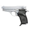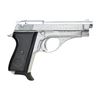 Cal. 380 ACP. S# T11725. Bbl.3.75". Factory engraved, chrome plated ExcamModel G.T. 38C. Serrated slide w/ fixed front blade & dovetailed rear sight. Left side controls including trigger safety & firing pin safety.. Bottom mag release. Full length guide rod. Imported through and marked "Excam Inc, Hialeah, Fla." on right side of frame. Black plastic checkered grips. Left grip has thumb shelf. MAGS: 1 steel 7rd. CONDITION: Heavy engraving on both sides of frame & slide. Light engraving on top of barrel & top of slide. Right grip fits proud on bottom rear. Bright bore w/ strong rifling. (22-5574/JZ). MODERN. $300-500.