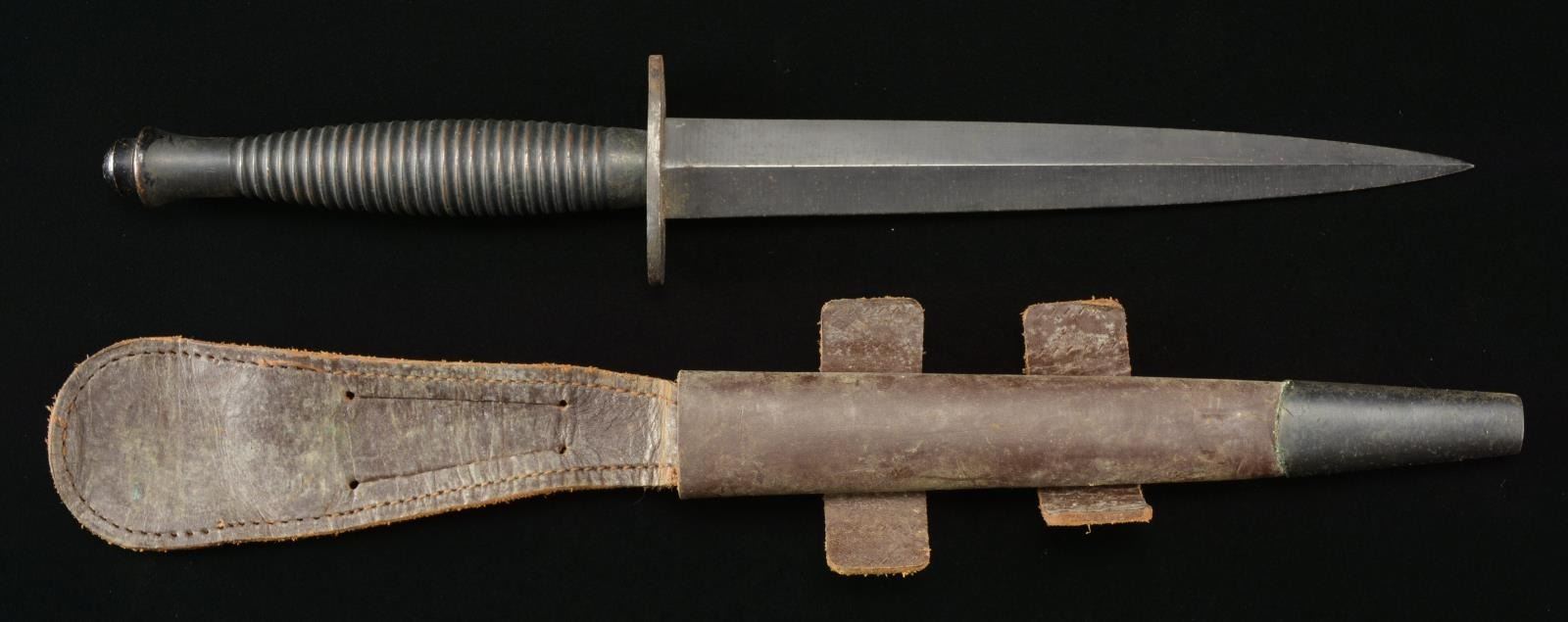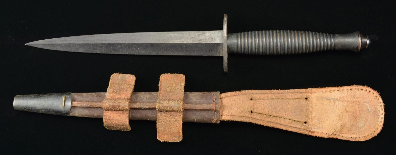 Overall length: 12 3/4". Blade length: 7". A WWII type Fairbairn Sykes commando knife featuring a spear point blued blade w/ raised medial ridge. Blued, guard stamped, "ENGLAND" on the top. Ribbed brass handle w/ aluminum pommel cap. Leather scabbard w/ brass tip. CONDITION: blade retains nearly all of its blued finish. Grip shows light wear w/ some coppery brass showing through. Guard has most of the bluing intact. Scabbard is lightly worn & a bit dirty but complete. (02-16758/BF). $300-500.