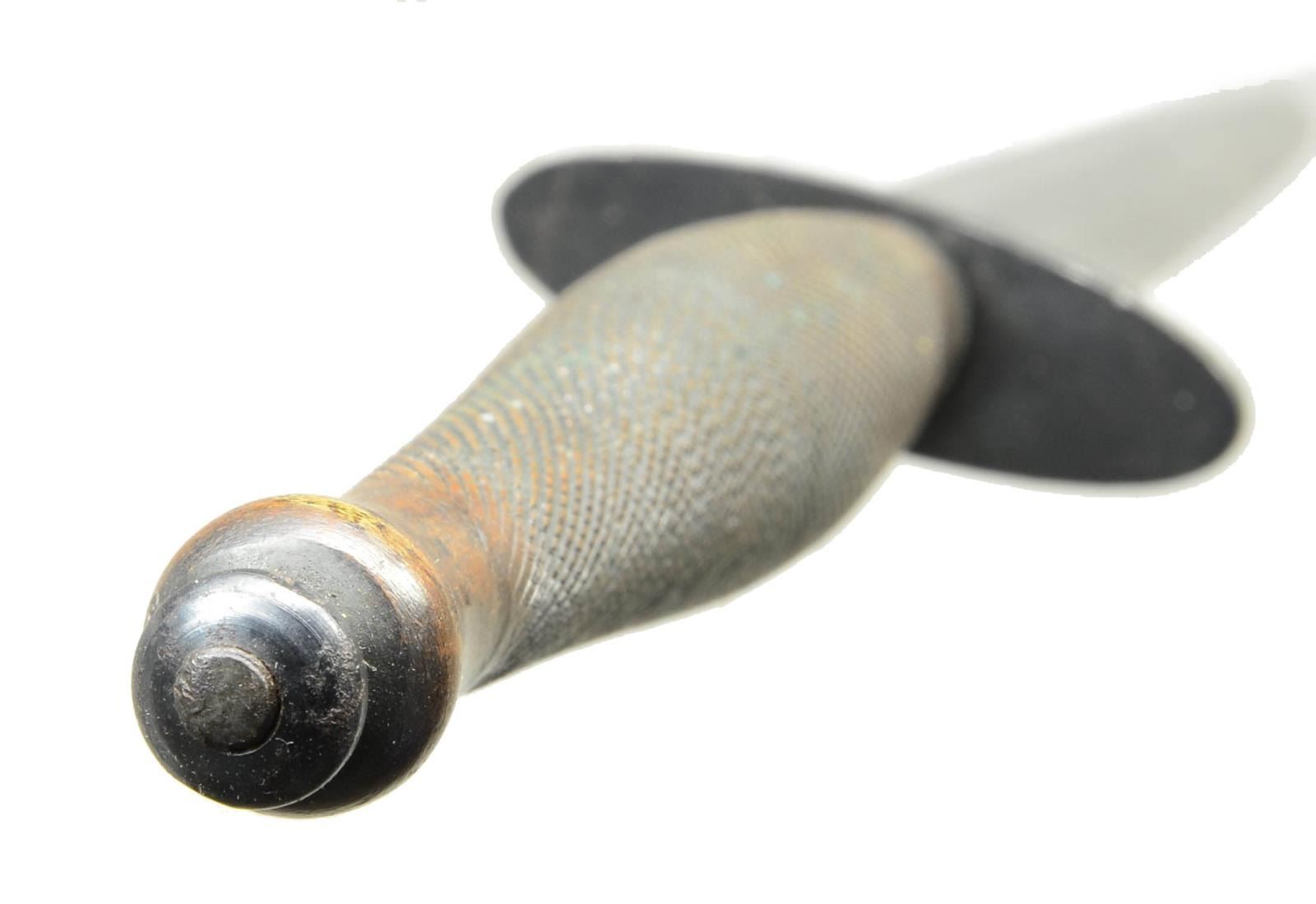 Overall length: 13". Blade length: 6 7/8". A WWII type Fairbairn Sykes commando knife featuring a spear point blade w/ raised medial ridge etched near the guard w/ British Arms & the words, “BY APPOINTMENT WILKINSON SWORD CO. LTD. LONDON”. Blued, unmarked guard. Cross hatched brass handle. Leather scabbard w/ brass tip. CONDITION: blade has a lightly peppered finish. Grip shows wear & a mustard brass patina. Guard has most of the bluing intact. Scabbard remains solid though worn. Retention strap is broken. (02-16759/BF). $300-500.
