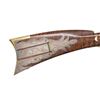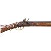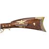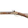FLINTLOCK RIFLE. Cal. 45. S# 1670. Bbl. 42" octagon measuring 3/4" across the flats. Top flat is hand stamped "C. KEMPER" followed by S# "1670". Cornell Kemper (1952-2003) was a builder of late flintlock period long rifles. Breech end of bbl. and tang are lightly ornamented with scroll engraving. Silver blade front sight on a dovetailed winged base with fixed V notch rear sight. Engraved trade style lock. Double set triggers. Full length Roman nose cheekpiece pin fastened stock of fine curly maple. Right side has a segmented rectangular lid silver patchbox with pineapple style finial having extensive floral and geometric pattern engraving. Additional engraved silver inlay includes cheekpiece plate, 2 curved cheekpiece ornaments, left side heel plate, 8-point stars on either side of the wrist, and an oval plate at top of wrist. Roman nose has a pointed non-engraved silver inlay extending from the buttplate peak. Silver inlays on both sides of forearm consist of acorns forward of the action with flying pigeons between the faceted brass thimble and 2 faceted pipes. Forearm also has ornate engraved brass escutcheons on both sides of all 3 stock pins. Artificially striped brass tipped hardwood ramrod. Brass furniture consists of crescent buttplate, engraved finger curl trigger guard, engraved pierced sideplate, engraved pierced toe plate, and engraved forearm plate. Engraved gold plated inlays include an open wing eagle on the cheekpiece, with a fish below the cheekpiece, heart behind cheekpiece, 2 half moons on both sides of the wrist, and sideplate. Additional non-engraved gold plated ornaments are found on both sides of the tang. Both sides of top tang have small pointed brass ornamentation. Toeline along with butt and comb areas of stock have highlights of incise carving. UNATTACHED ACCESSORIES: a handwritten letter dated November 2, 1988 from C.J. Kemper, custom builder of Kentucky rifles from Ferdinand, IN. stating that he built this rifle in the fall of 1968. Also included is other letters, photos, and inventory information. CONDITION: fine. Bbl. and lock retain most of their original brown finish showing slight edge and carry wear. Original wood finish shows a few small marks. Silver inlays are beginning to acquire a pleasing mild tarnish. Toe of silver heel plate is broken thru the nail hole. Sound lock. Very good bright bore. (01-27947/DS). ANTIQUE. $5,000-8,000.