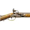 Cal. 54. NSN. Bbl. 41" octagon w/ rifled bore. Rocky mountain front sight w/ fixed V notch rear sight. Engraved trade lock has added marking “Warranted”. Plain trigger. Metal has an antiqued browned finish. 4 Wedge fastened full length stock of curly maple. Stock has ornate relief carving behind & below cheekpiece, around wrist & forward of lock & sideplate areas. Ramrod channel has full length incise carving w/ wavy line extending past the thimble. Right side has a rectangular lid pierced & segmented brass patch box w/ hand engraving & fancy finial. Brass finger curl trigger guard. Other brass fittings consist of engraved sideplate, crescent buttplate, engraved toeplate, 8 pointed star on cheekpiece & oval wrist plate. Engraved faceted brass thimble w/ 2 faceted brass pipes holding a steel tipped hardwood ramrod. CONDITION: metal has original brown finish giving antique appearance as it was intended to. Stock has very good finish. Toeplate shows some warpage w/ gap in stock. Sound lock. Good bore w/ strong rifling. (01-21719/DS). ANTIQUE. $1,000-2,000.