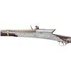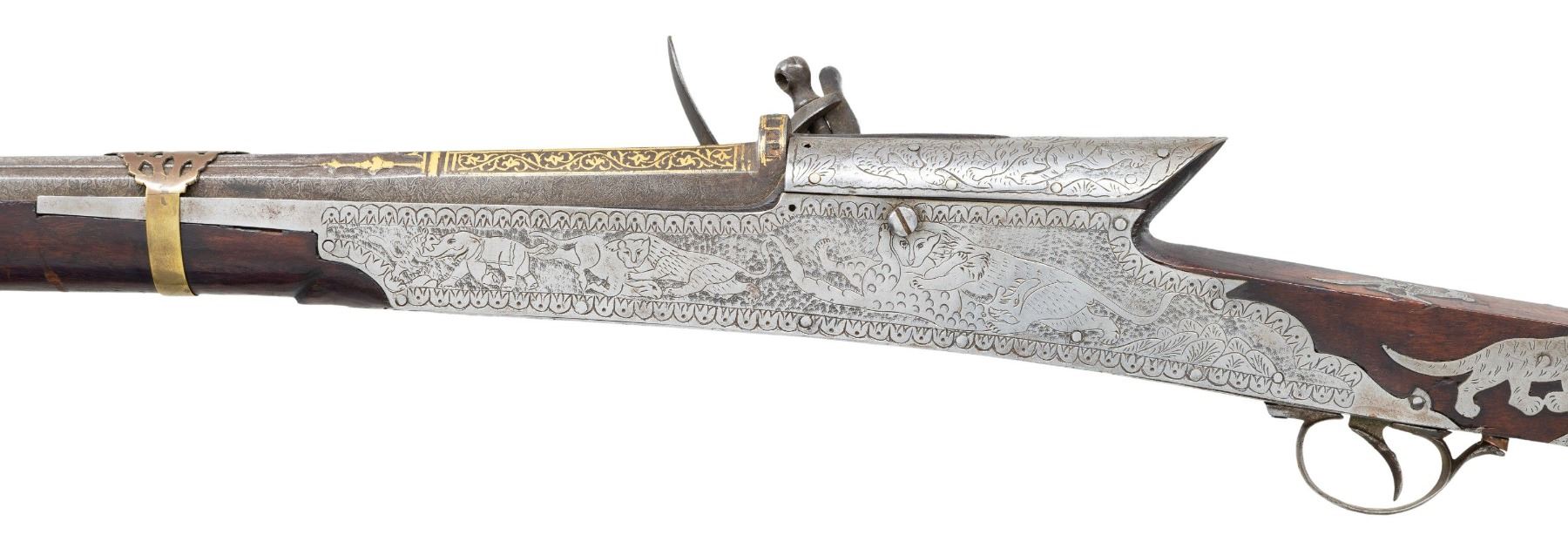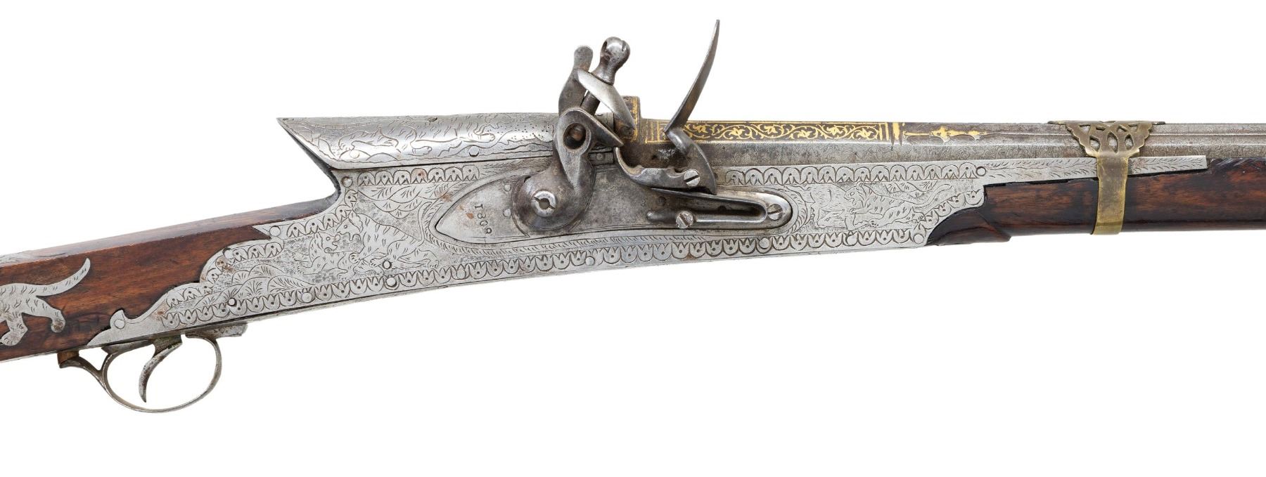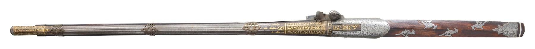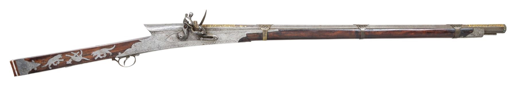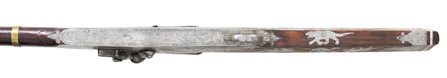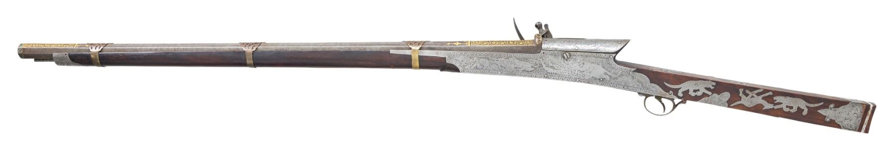 Cal 65. NSN. 55" overall, 34.5" gold damascene embellished earlier Ottoman Damascus rifled barrel, inset turquoise cabochons around muzzle and edges of integral rear sight, 3 pierced brass barrel bands, polished steel plates around 1808 dated lock & breech engraved with elephants, tigers, and other animals, 16 engraved steel insets of animals adorn butt stock with 2 thin ivory bands at butt. CONDITION: very good to fine overall, Mechanically functions, but spring weak, sharp deeply rifled bore. PROVENANCE: Estate Collection of Dr. Curtis S. Morse. (01-26308/JS). ANTIQUE. $2,000-3,000.