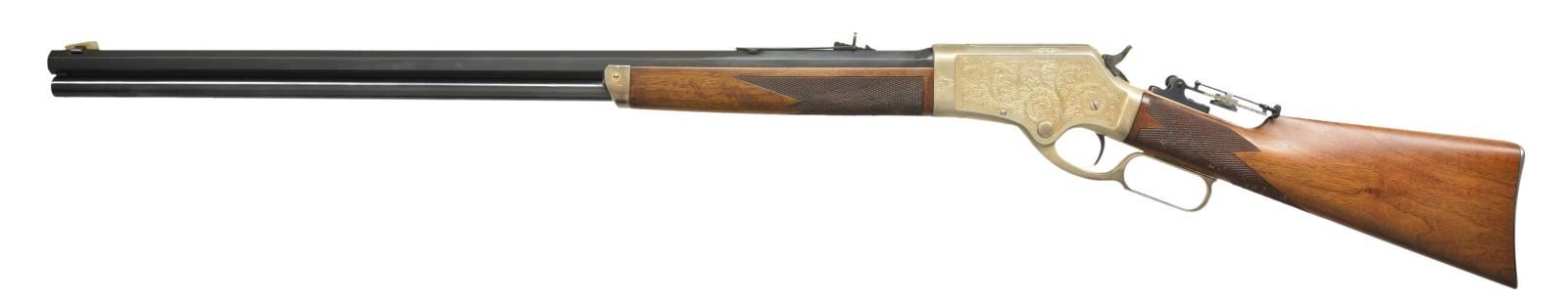 RIFLE. Cal. 45 Gov’t (45-70). S # 4568. Bbl. 28" octagon. German silver blade rocky mountain front sight, semi Buckhorn rear sight with midrange Vernier tang sight. Full length mag. Nickel finished action has deep scroll pattern hand engraving by an unknown hand. Sides of receiver have deeply cut vine type foliate scroll with punch stock backgrounds and straight line borders. Complementing scroll continues to upper and lower receiver areas and top tang. Breach bolt has circular Whitetail Buck’s head bracketed by wedges of scroll. Straight grain black walnut forearm and straight grip stock have added borderless hand checkering. Steel shotgun butt and forearm cap are silver finished. Serial number indicates 1883 mfg. CONDITION: nicely restored rifle. Bbl. and mag tube retain nearly all re-blued finish. Receiver has a satin re-nickeled finish. Hammer is re-case colored. Very good refinished wood and checkering. Buttplate and forearm cap retain nearly all silver finish having acquired a mild dark tarnish. Sound action. Very good bore retains strong rifling. (01-22317/DS). ANTIQUE: $3,500-5,000