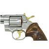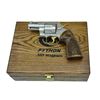 COLT PYTHON. Cal. 357 Mag. S# 13311EH. Bbl. 2-1/2” with ventilated rib and full lug. Balance of metal is nickel plated with 24 karat gold plated serrated ramp front sight, adjustable square notch rear sight, hammer & trigger. 6-shot fluted cylinder. 2-piece checkered laminated walnut finger groove Custom Shop grips. UNATTACHED ACCESSORIES: matching numbered hinged hardwood case with blue velvet interior containing manual. CONDITION: all aspects near excellent; appears new & unfired. (23-808/BH). MODERN. $5,000-7,000.