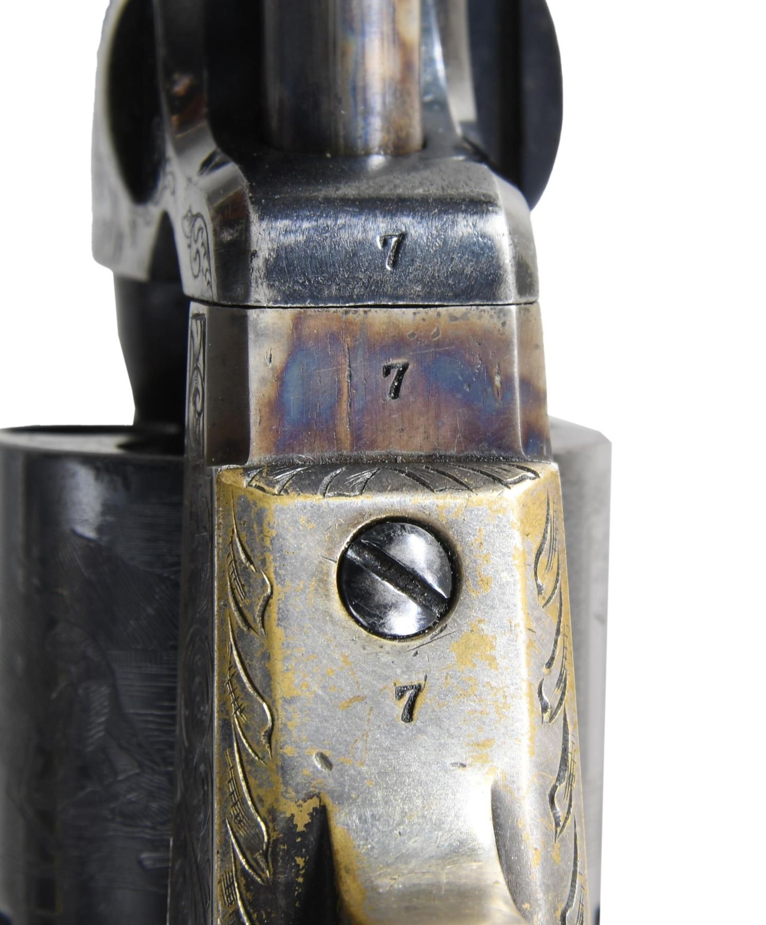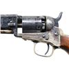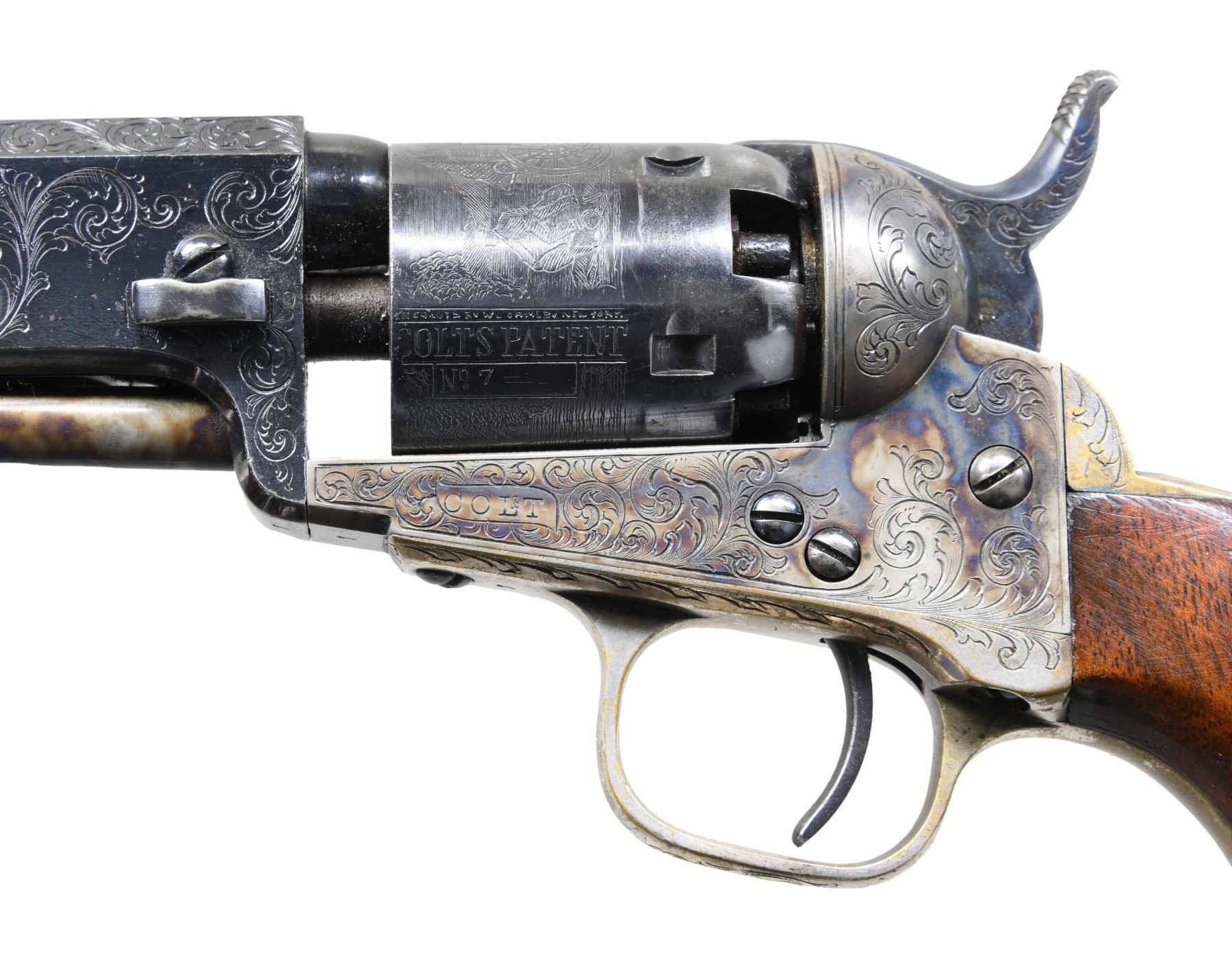 POCKET NAVY REVOLVER. Cal. 36. S# 7. This is an anomaly of standard production 1862 pocket navy with 2-line London address, custom English style light scroll engraving and re-numbered "7" throughout. The few rare known London 1862s are in 5-digit range and they are London proofed. This revolver has no London black powder proofs, so it makes little sense as to the configuration. It does however present beautifully. Accompanying Colt red baize lined walnut case is compartmented for pistol, brass bag flask, reblued "COLTS PATENT" 2 cavity mold, and large ELEY-LONDON cap tin. CONDITION: excellent as customized, retains almost all of the new bright blue and case color finish. Backstrap and trigger guard retain about 80-90% patinaed silver wash. Mechanics are fine, crisp rifled bore with pitting. Case is very good. (01-26734/JS). ANTIQUE. $1,500-2,500.