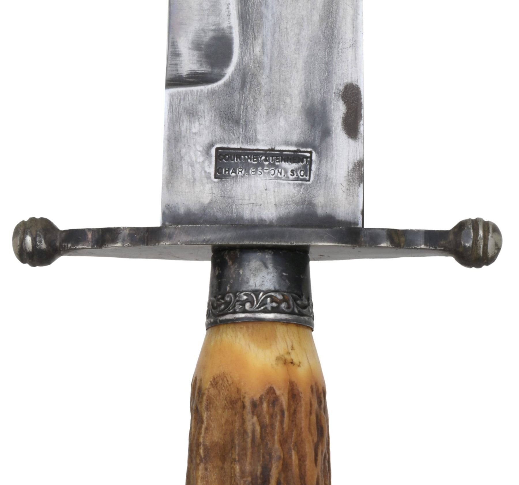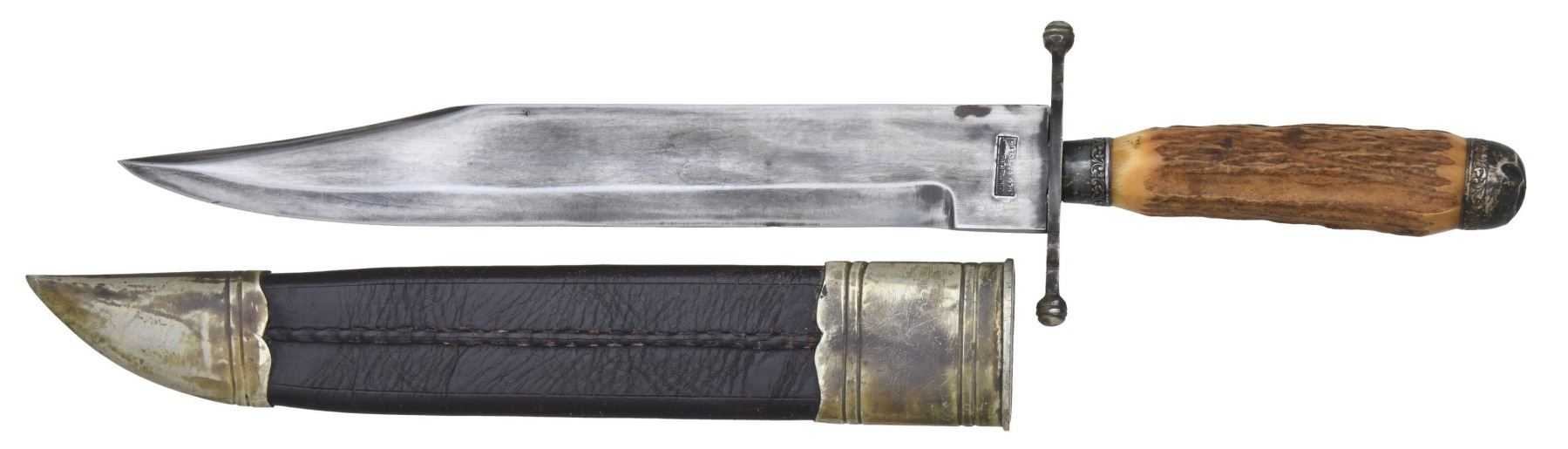 16" overall, 10.5" clip point blade, cutlery stag handle, silver & German silver mounted including sheath.