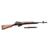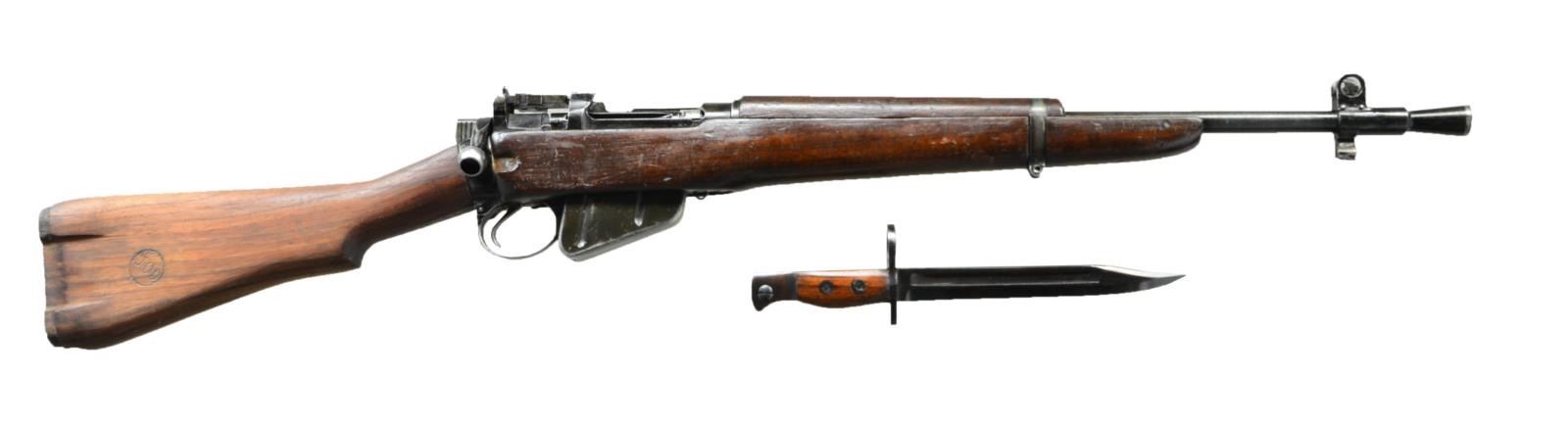 Cal. 303 British. S #B157. Bbl 20 1/2" w/ flash hider. Forend appears armory renumbered to match but other parts are unnumbered or mismatched. Correct No. 5 features, w/ hollowed out bolt & lightening cuts. Right side of receiver properly marked "No5MKIROF (F) 9/44 S#". Ladder rear sight correctly graduated to 800yds. Blade front sight w/ protectors. Bayonet lug present. Front sling swivel, front swivel sling screw & rear sling hardware missing. Buttplate assembly also missing. Hardwood stock set. Buttstock appears to be unfinished reproduction w/ "JOD" roundel on right side. MAGS: 1-10 rd. unnumbered magazine. UNATTACHED ACCESSORIES: Indian made 8" Jungle Carbine bayonet. Blade marked "RFI" for Ishapore factory. Metal parts of bayonet retain most of their black paint finish w/ light flaking and handling wear. Smooth grip panels show dings and handling marks. CONDITION: forend & handguard retain much of their arsenal oil finish w/ some dings & handling marks. Buttstock shows handling marks & light scratches. Metal retains 50% original Suncorite w/ scattered thinning & flaking most notable on bbl. Good bore w/ light pitting & frosting but strong rifling. (22-2493/MJC). CURIO. $500-700.