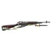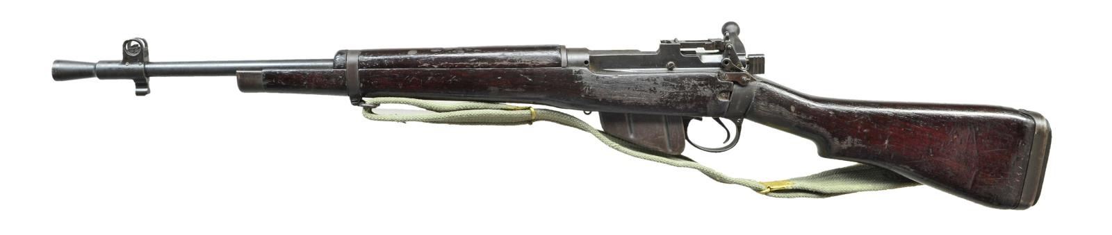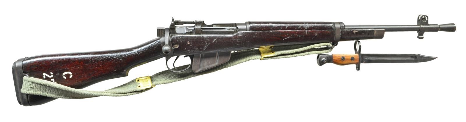 Cal. 303 British. S# B2626. Bbl. 20 1/2" including cone shaped flash hider; sight blade marked "F" broad arrow "V" & "O". Mfg. 1945 w/ correct features to include: matching bolt having hollow handle, receiver lightening cuts, shortened forend set, steel framed rubber recoil pad, side sling mount & 4th variation 200-800 rear sight having milled parts plus 2nd variation 1/2 threaded elevation screw. Buttstock w/ 874 stamped on left by recoil pad holder, 58 stamped behind trigger guard & "C" over 27 in white paint on right side of buttstock. Receiver w/ FTR rebuild mark. 2nd variation safety w/ serrated cross drilled thumbpiece retained by cross pin. No, 3 bolt head. Lanyard loop on trigger guard that is narrowed behind screw but inletted for non narrowed guard. Import marked on bottom of bbl. behind bayonet lug. Light green canvas sling marked "J.S.&S.Co." & date that appears to be 1953; brass metal ends. Underside of forend faintly marked B2626. 2nd variation bayonet marked "R.F.1" having wood handles retained by 2 bolts. 8" blued blade w/ fullers. MAGS: fair refinished 10 rd. numbered BD5258 plus prior number X'd out; body dents & prior pitting. CONDITION: good appearance w/ metal finish best appearing. Forend cap, butt pad retainer & bbl. band w/ brown patina. Extra finish, handling marks & scraped finish on stock set. Very good sling set. Fair to good bore w/ wear & noticeable frosting to light pitting throughout. PROVENANCE: from the estate collections of Charles P. Obremski. (22-1362/NW). CURIO. $500-750.