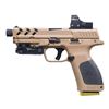 Cal. 9mm. S# T6368-21AV008671. Bbl. 4.75". FDE Polymer frame, striker fired pistol. Dual serrated slide w/ lightening cuts. Threaded barrel w/ knurled thread protector. Accessory rail below barrel, currently hosting Votali H3L-G green laser sight & Derry red-dot sight in place of rear sight. Black rubber grip insert. Loaded chamber indicator. MAGS: 1 factory 17 rd. CONDITION: Finish complete & consistent w/ very little sign of prior use. Sight & light appear to function as intended. Bore is bright w/ strong rifling. (24-6354/JZ). MODERN. $400-600.