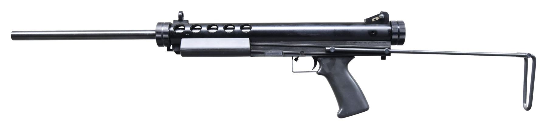 Cal. 9mm Luger. S# A90282. Mfg. in Boulder, CO 1988-1995. Bbl. 17". Hooded post front sight & adj. aperture rear sight. Black anodized finish. Black synthetic forearm grip & pistol grip. Right side lever safety. Telescopic skeletonized wire stock. MAGS: NONE. CONDITION: all aspects very good to near excellent showing minor handling marks. Bright near excellent bore. (25-2241/MD). MODERN. $300-500.