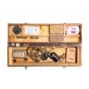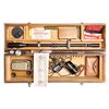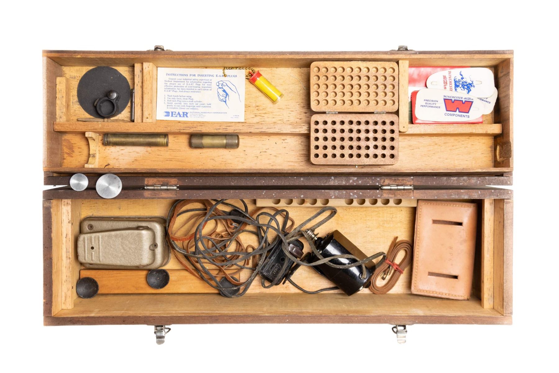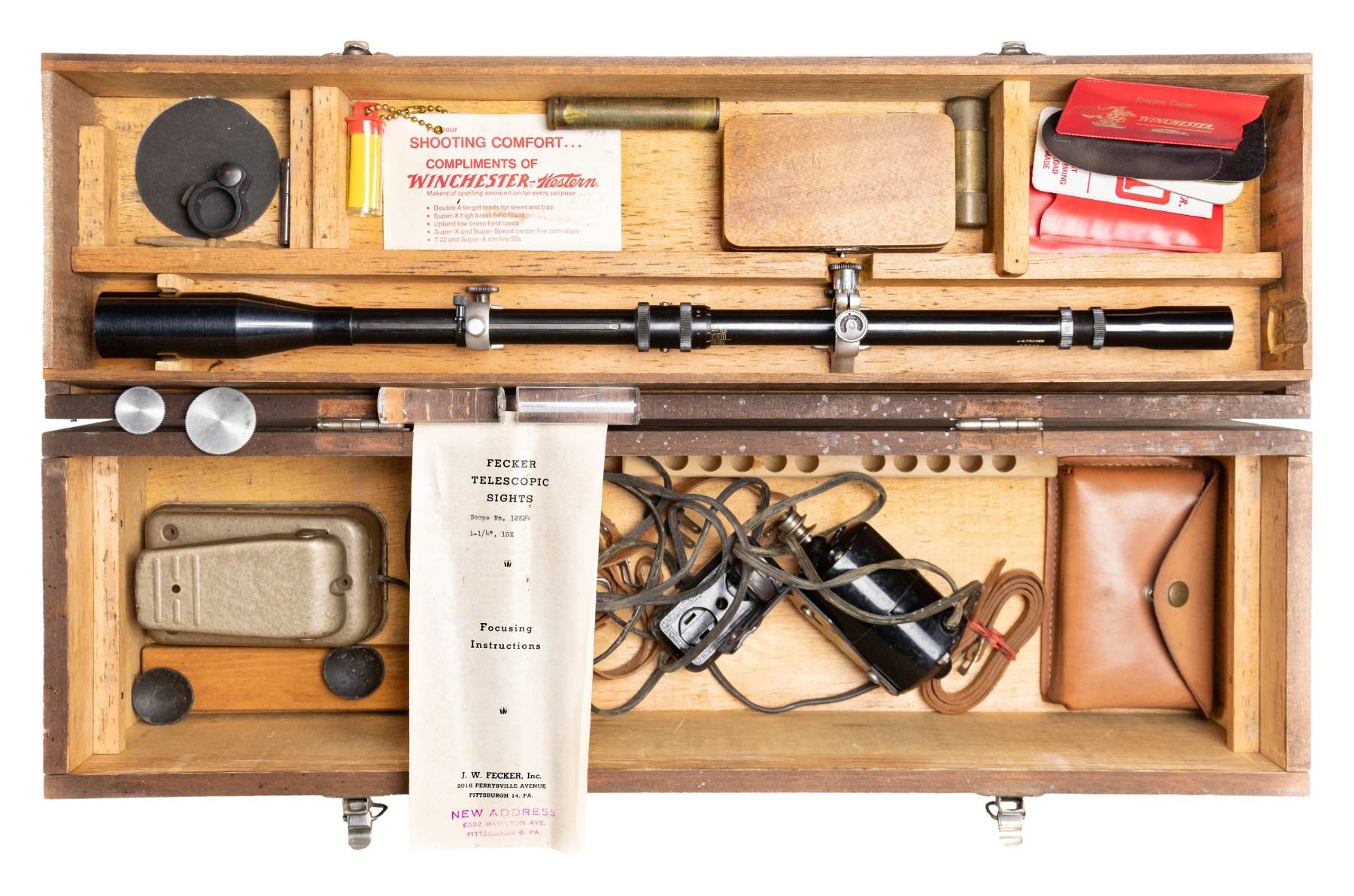 Good vintage wooden carry case for shooters' accessories having 22 LR cartridge block, misc. small items plus sewing machine motor with pulley and foot control (aged cord but functional). Fecker scope in spectacular like new condition having screw in aluminum lens caps. Serial number 12734 and Fecker natural aluminum mounts; no recoil spring. Scope length is 23", 3/4" tube and 1 1/4" objective lens. Cross hair reticle and a fine conditioned original instruction manual. Very innovative target scope with parallax at mid point rather than on objective lens like Lyman and Unertl. PROVENANCE: Norman Olliff Estate. (02-25699/NW). $450-600.
