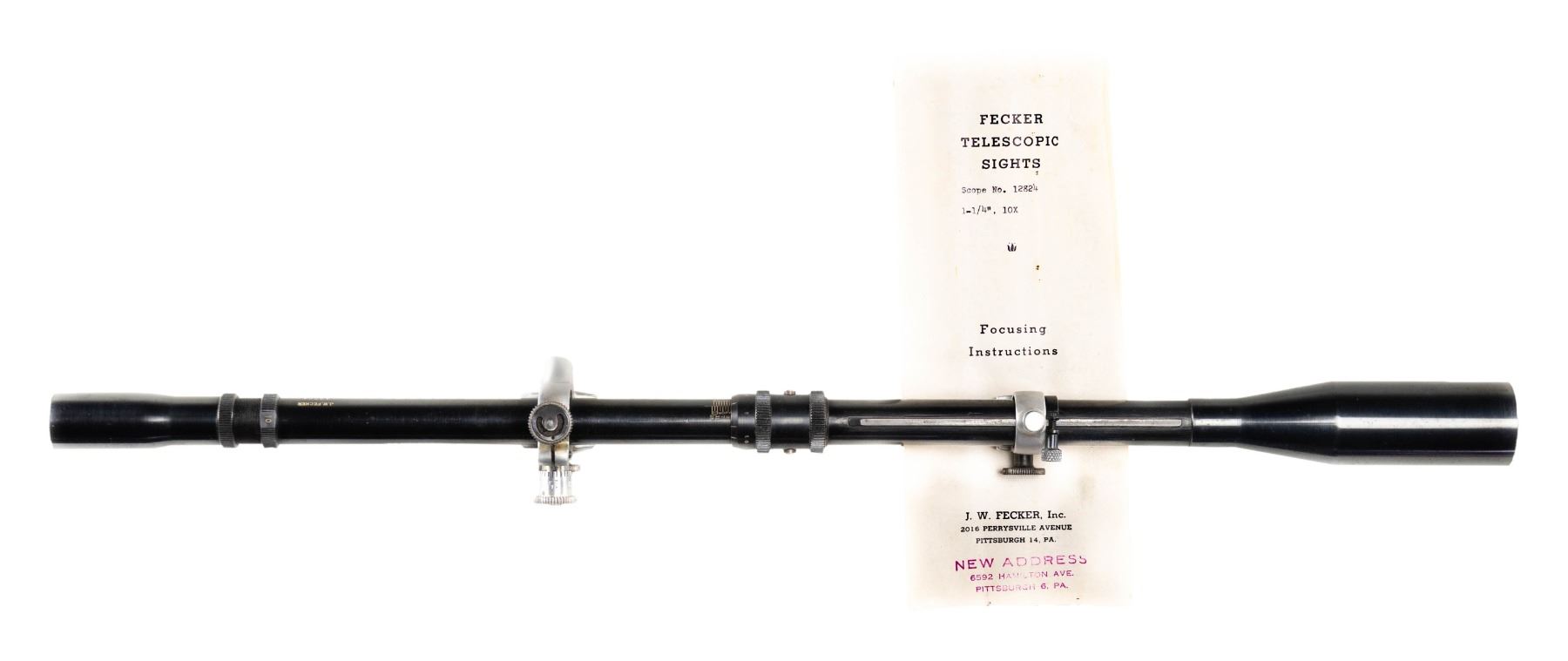 FECKER 10X TARGET SCOPE & SHOOTER'S ACCESSORY BOX.