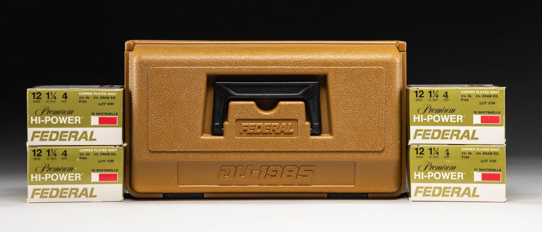 WITH AMMUNITION. Ducks Unlimited brown synthetic ammunition case produced by Federal circa. 1985. Exterior of lid is marked "FEDERAL" above "DU-1985". Case contains x4 boxes 25-rd. boxes (100-rds. total) of Federal Ducks Unlimited 1985 Hi-Power 12 GA, 2 3/4", 1 1/4 oz. shot, 4 shot, copper plated shot ammunition. CONDITION: case is excellent overall. Ammo boxes show scattered handling marks, some dents, as well as some creases, but otherwise remain sound. Ammunition appears serviceable. PROVENANCE: Norman Olliff Estate. (02-25698/MLW). AMMO. $35-50.