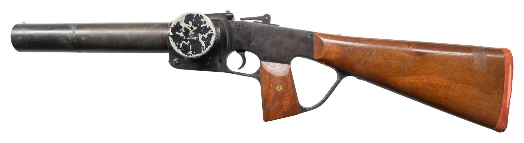 Cal. 1.5" (37mm). NSN. Bbl. 12". Standard configuration Federal Riot Gun. Aperture rear sight. Black enamel finish. Hardwood stock with red recoil pad. Bottom of lower tang has white painted letters "AN". Data card present. CONDITION: stock has older added finish with some tape remnants, scattered finish loss, handling marks, dings & scratches. Recoil pad shows scattered deterioration, cracking, crazing & age related wear. Metal shows scattered flaking, edge wear, handling marks & light oxidation. Action appears functional when hand cycled. Bore shows scattered fouling but appears very good. PROVENANCE: From the PMRB Collection. (02-25852/MJC). NON-GUN. $200-400.
