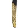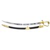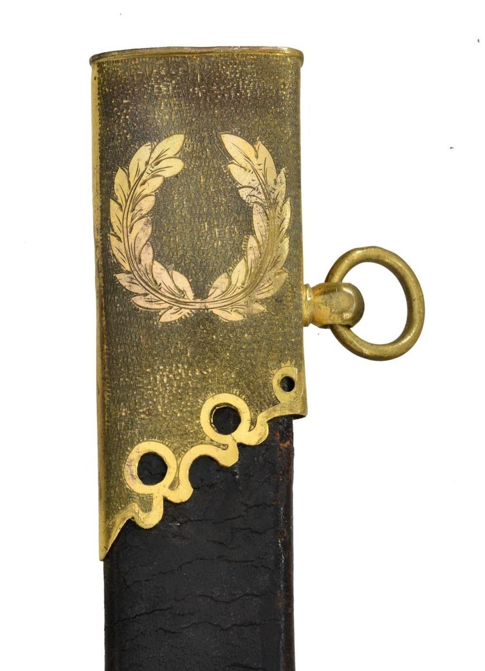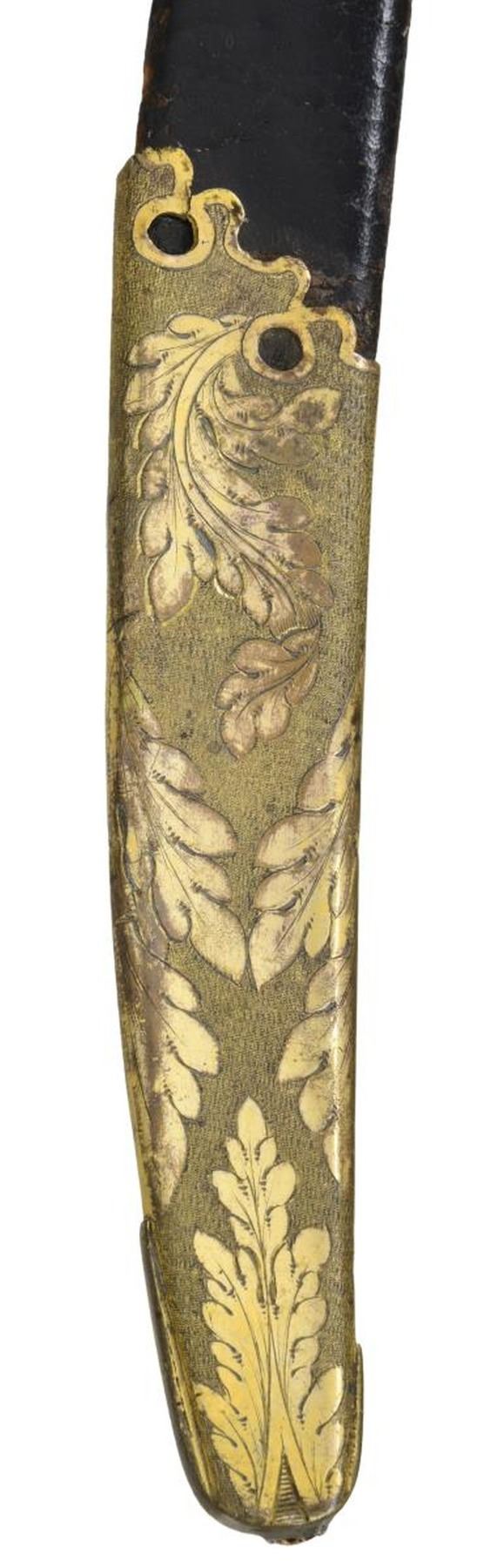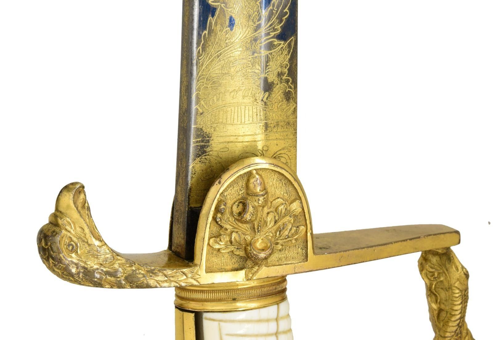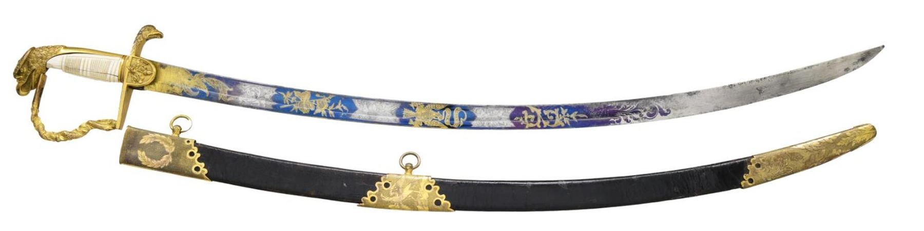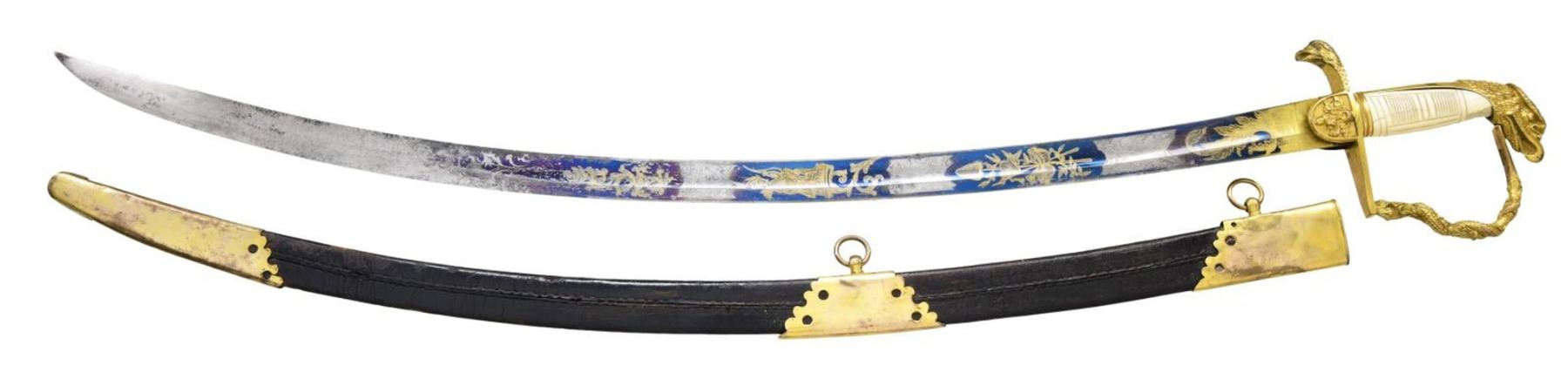 STUNNING TRI-COLOR BLADE. Overall length: 38 1/2". Blade length: 33 1/4". Blade has a single wide fuller with gilded etching on a blued field amongst white panel highlights. This beautiful blade has four separate areas of gilded etching on each side, separated by white (unblue) foliate-decorated panels. Etching includes a large spread-wing American eagle with a ribbon in its beak that reads “E PLURIBUS UNUM”. There is also a seated Indian warrior princess, two large sprays of arms, and four areas of foliate decoration. There is a scalloped-top banner near the ricasso that reads “WARRANTED”. The gilded brass hilt includes an exceptionally well-done feathered eagle head quillon, and both languets are embellished with oak leaves and acorns. The knuckle bow features a seldom-seen, well-articulated serpent curled around oak leaves. The eagle's head pommel shows intricate detail and flows seamlessly into a faceted backstrap. Carved ivory grip with both horizontal and vertical linear decoration. The gilded brass-mounted leather scabbard has a wreath engraved on the top mount. A large American eagle on rocks adorns the middle mount, and there is ample foliate decoration covering the tip/drag. Obviously, a sword for a very high-ranking officer, possibly a general. CONDITION: the blade has a few areas of cleaned pitting near the tip, not affecting the highly decorative blade. Nearly all of the gilded highlights remain in the etching, and the blued field is 90% and retains stunning color. The three white panels on each side of the blade serve to highlight and even accentuate the fine etching. The hilt is a bit loose but does retain nearly all of its original gilded finish. There is one notable age-related crack in the body of the grip and some minor chipping at the base of the pommel. The scabbard remains quite solid, but the body is a bit flexed and very slightly flaked. The mounts retain nearly all of their original gilded finish. (02-22673/BF). $3,000-4,000.