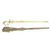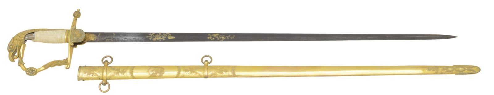 1) SWORD. Overall length: 34 1/2". Blade length: 29 1/4". Blade has a raised medial ridge and features gold highlighted etching on a blued field. Etching includes various foliate motifs and sprays of arms, one of which includes a Liberty cap on pole, American shield and a cannon barrel. Heavily gilded hilt features a raised wing eagle motif on the shield shaped languets. Quillon is nicely embellished with laurel leaves on 1 end of the crossguard. A stylish knuckle bow emanates from the opposite end of the crossguard. Heavy acanthus leaves and a central medallion decorate the knuckle bow. Graceful eagle head pommel with a ball in the eagle's beak. Eagle feathers extend over halfway down the faceted backstrap. Carved and decorated certifiably antique ivory grip. Very heavily gilded scabbard with decorative floral and geometric engraving on the front along with an artistically rendered raised wing eagle and shield between the scabbard rings. The sword is accompanied by its original period buckskin traveling case. The case is handmade and handsewn with a large flap at the top to cover the hilt. Family history since the 1820's has stated the sword was presented to General Andrew Jackson from some grateful citizens of New Orleans. It is maintained that the sword was given to Doyle O'Hanlon, or perhaps Andrew O'Hanlon, by Jackson himself. The sword has passed through generations of the O'Hanlon family to present day. UNATTACHED ACCESSORIES: a copy of a newspaper article with Andy O'Hanlon holding the sword during a Jackson Day celebration held annually on January 8th. A copy of a partial O'Hanlon family tree and information on Doyle O'Hanlon. CONDITION: the once tricolored blade has most of the white and blue field obscured by overall light oxidation. However, most of the etching remains clear and well gilded. Hilt is loose but retains nearly all of its original heavily gilded finish. The grip is missing a small section of ivory at the top that measures approx. 7/8" x 7/8". The scabbard shows very light wear overall and also retains virtually all of its original heavily gilded finish. The buckskin case shows heavy use but appears to remain substantially complete. The seam of the shaft is open over about 50% of the case. The upper flap, as well as its closing holes, are surprisingly intact. This case is a very rare survivor of its form as it was likely made on a plantation, miles from a professional sword cutler.