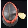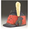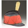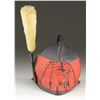 HELMET. A fine, early black leather jockey-style helmet generally worn by mounted dragoons, dating from about 1812 to 1825. This helmet has an overall black finish on the exterior with a 4" wide linsey-woolsey red band around the helmet. The red band is crudely X-stitched on the front, indicating that there was originally a plate on the front of the helmet. The red band is highlighted by gold bullion cord stitched primarily in a triangular pattern around the exterior of the band. The comb at the top shows no indication of ever having bear skin attached. On the left side is a classic leather cockade with a brass American eagle attached. At one time, there was a brass ribbon above the eagle’s head that likely read "E PLURIBUS UNUM". Nice, wide, wrap-around brim, as often seen in jockey helmets from this time period. The interior is raw, unfinished leather with a sewn black border band at the base. There is no remaining sweatband or liner of any type. The helmet includes a white wool pompom measuring 10" overall, including a 4 1/4" baleen post. CONDITION: helmet remains quite solid for its age, with little or no damage and no distortions to its form. The red band has significant insect damage but does remain substantially intact. The cockade has its original attachment to the helmet, and, as stated, the eagle is missing its ribbon. Pompom shows expected discoloration but remains solid. (02-23276/BF). $2,500-4,000.