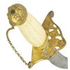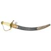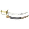 NAVAL DIRK WITH CURVED BLADE. Overall length: 16". Blade length: 11". Large curved blade has a false edge extending 3 1/4" back from the tip. Blade is etched over 3/4 of its length with various foliate motifs. Gilded brass hilt features an S shaped guard with decorative pierced leaf, feather and shield design on 1 side. 1 Disk quillon is pierced to accept the chain guard that leads to the fully articulated lion's head pommel. Decorative ferrule and a reeded certifiably antique ivory grip. Gilded brass mounted leather sheath. Suspension rings are present. CONDITION: blade has a light to medium gray patina. Etching is light but discernable. Hilt retains approximately 70% of its original gilded finish. Grip is undamaged. Sheath is quite strong with some flaking. The 2 mounts retain approximately 10% of their original gilded finish with the balance being an attractive, deep mustard patina. (02-17500/BF). $1,800-2,500.