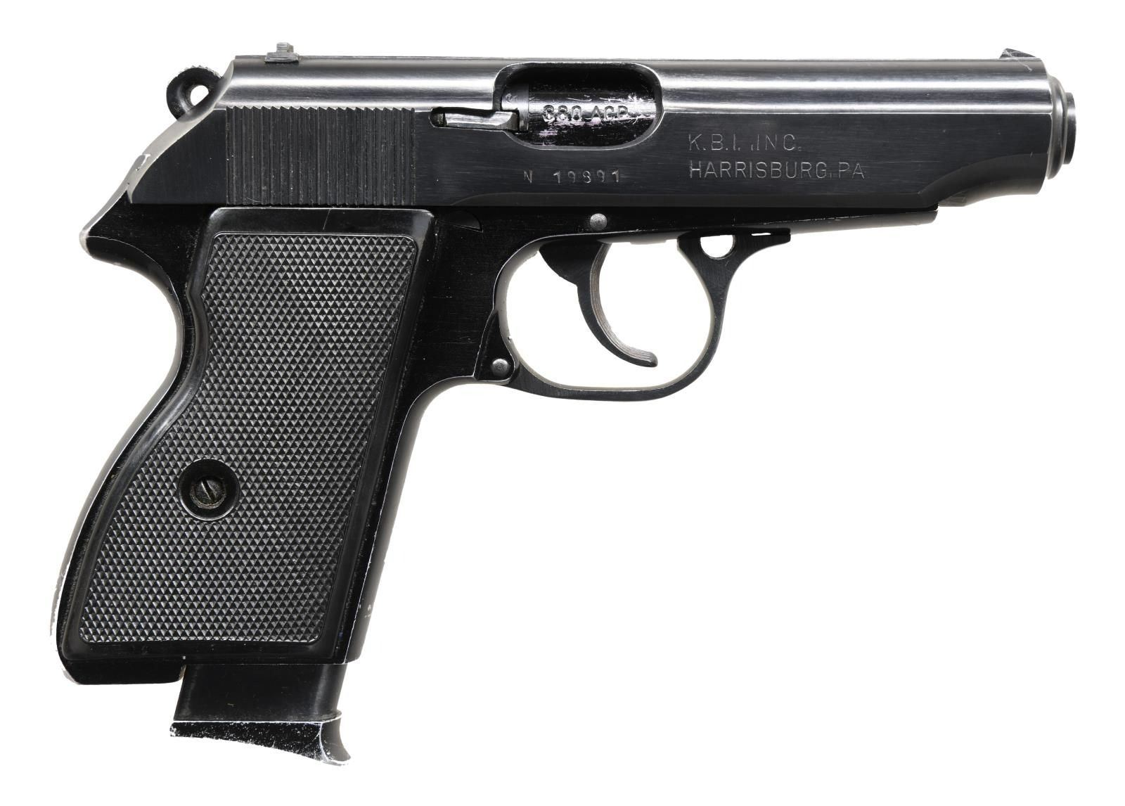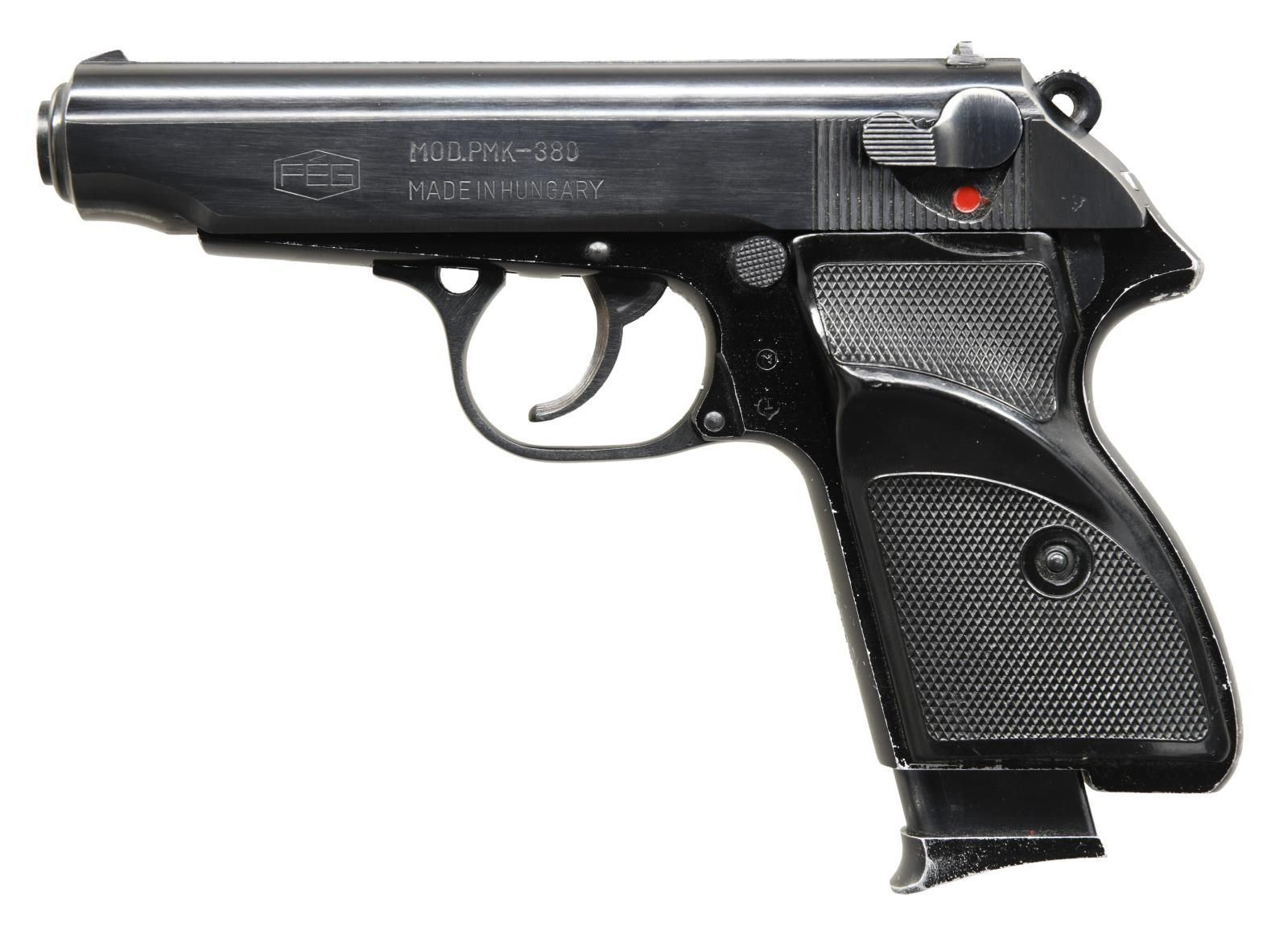 Cal. 380 ACP. S# N19891. Bbl. 4". Small blade front sight. Fixed rear sight. Hungarian made pistol similar to the PPK imported by KBI. Blued slide. Anodized frame. Black checkered grips. MAGS: 1-7 rd. UNATTACHED ACCESSORIES: right Uncle Mike's nylon Sidekick holster. CONDITION: grips show some light dings & handling marks. Metal retains 80% original finish w/ most loss due to flaking on the straps. Very good plus bright bore. Provenance: From the Estate of Harry Henry. (23-5110/MJC). MODERN. $200-300.
