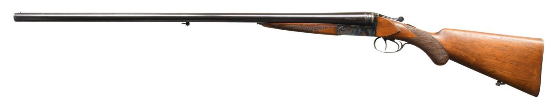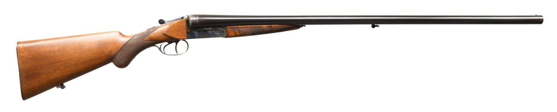 Cal. 12 ga. 2 3/4". S# 400. Bbls. 30" of fluid steel. Fixed full & full chokes. Case colored boxlock action w/ double underlugs, side clips & crossbolt locking. Double triggers, extractors. Splinter forearm & round knob walnut stock w/ hand checkering. LOP: 14" over case colored grooved steel shotgun buttplate. Toeline of stock & bbl. have sling swivels. WEIGHT: 6 lbs, 13.8 oz. CONDITION: over 90% blue & case colored finish. Refinished wood has slightly thinned checkering w/ a small chip behind top tang. Very good bright bores. (23-4841/DS). CURIO. $500-800.