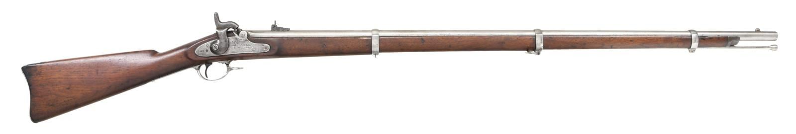 Cal. 58. NSN. Bbl. 40". Blade front sight. Dual left folding rear sight. Lock has 1862 date, US eagle & "L.G.&Y WINDSOR-VT" markings. Bbl. & upper tang appear unmarked. Walnut stock w/ bottom mounted sling swivel. Tulip shaped ramrod present. Left stock flat has faint inspector's cartouche & a shamrock "IR" marking denoting ownership by the Fenian Brotherhood. The Fenian Brotherhood were an Irish nationalist movement who launched failed invasion of Canada in an attempt to gain Irish independence. CONDITION: sanded stock has a few chips, a a couple grain cracks on butt, scattered dings & handling wear. Lock assembly is mostly a dull gray patina w/ scattered pitting & oxidation. Balance of metal is cleaned to bright w/ scattered pitting & oxidation. Oxidized bore. (01-23448/MJC). ANTIQUE. $600-900.