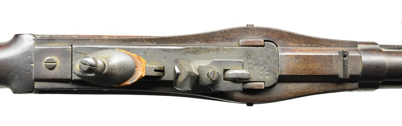 MADE AT HARPERS FERRY. Cal. 52. S# NSN. Bbl. 32.75". Fine example of 1st US government breech loading rifle, standard configuration 52.75" overall, multi-groove rifled brown finished barrel, unique left offset front blade & fixed rear sight due to battery on top right of breech, 3 pinned iron bands, hinged tilt up breech block marked "J. H. HALL / H. FERRY US / 1832", walnut stock. Most of these rifles were converted to percussion for Civil War, but this is beautiful survivor in original flint configuration, complete & original. CONDITION: very fine, iron retains most of its original arsenal brown, crisp markings. Stock has raised grain with minor cosmetic storage dings & dents, no cracks or chips like seen on majority of survivors. Mechanics crisp, bright shiny crisp rifled bore with short rebated smooth "starter" at muzzle. PROVENANCE: Michael E. Bray estate collection. (01-23287/JS). ANTIQUE. $3,000-5,000.