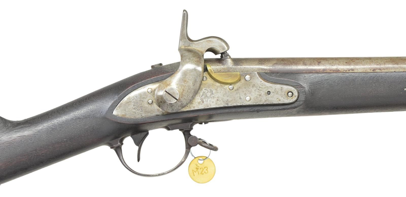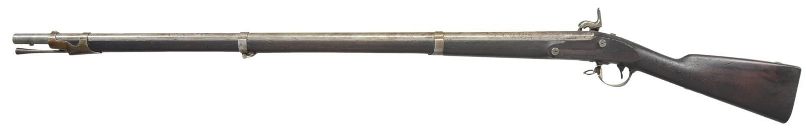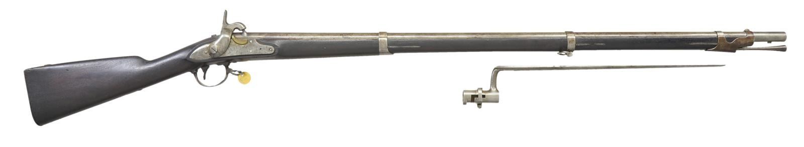 MUSKET, NATIONAL ARMORY PERCUSSION ALTERATION & BAYONET. Cal. 69. NSN. Springfield altered most of its 30,000 production of 1840 flintlocks manufactured, almost 27,000 were altered in 1851. This being one that saw little use and is in beautiful complete original condition. Alteration consisted of modification of lock, removing external battery components, and cutting and plugging pan, plugging vent, and drilling a new hole for cone near top of barrel, and adding new percussion hammer. Locking bayonet and trumpet head ramrod are of 1842 pattern. You can’t find one a whole lot better unless its unfired. CONDITION: very good to fine overall, smooth toned iron patina, pitting at breech, crisp lock markings, and very good barrel markings, matching “1842” dates on tang & lock. Stock is very good with raised grain, good cartouche, few scattered cosmetic blemishes. Mechanics crisp, clear dark bore. Bayonet fits well and matching condition to gun. (01-22767/JS). ANTIQUE. $1,500-2,000.