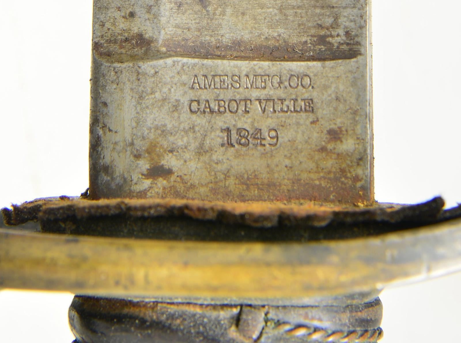 36” blade marked “AMES MFG CO / CABOTVILLE / 1849” and “US / WD”. Pommel and top ring mount of scabbard with matching inspection initials.