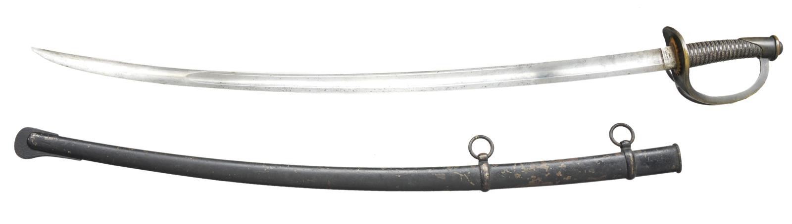CONDITION: very good to fine overall, grip is tight retaining all its original leather and wire, brass hilt has dark patina, blade is uncleaned, gray/bright with scattered staining, serrated edges to original protective washer, original scabbard has been painted black which appears to have smooth gray surface with small areas of pitting at drag. This is a very nice Saber which would be difficult to improve. (02-18148/JS). $700-900.