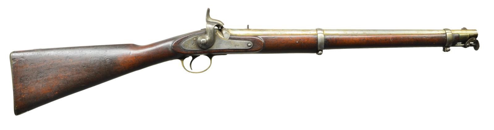 CARBINE. 17 bore. S#185. 36.5" overall, 21" barrel with British military proofs, "17" gauge (about .64cal), "185", iron mounted, fixed rear sight, 2 barrel bands, captured swivel loading assembly, "VR" cypher, "1859 / TOWER" and broad arrow proof on lock. CONDITION: very good to fine overall, gray smooth metal, stock sound with arsenal marking and proofs, well fit, missing sling bar, mechanics fine, smooth clear bore. (01-21509/JS). ANTIQUE. $1,000-1,500.