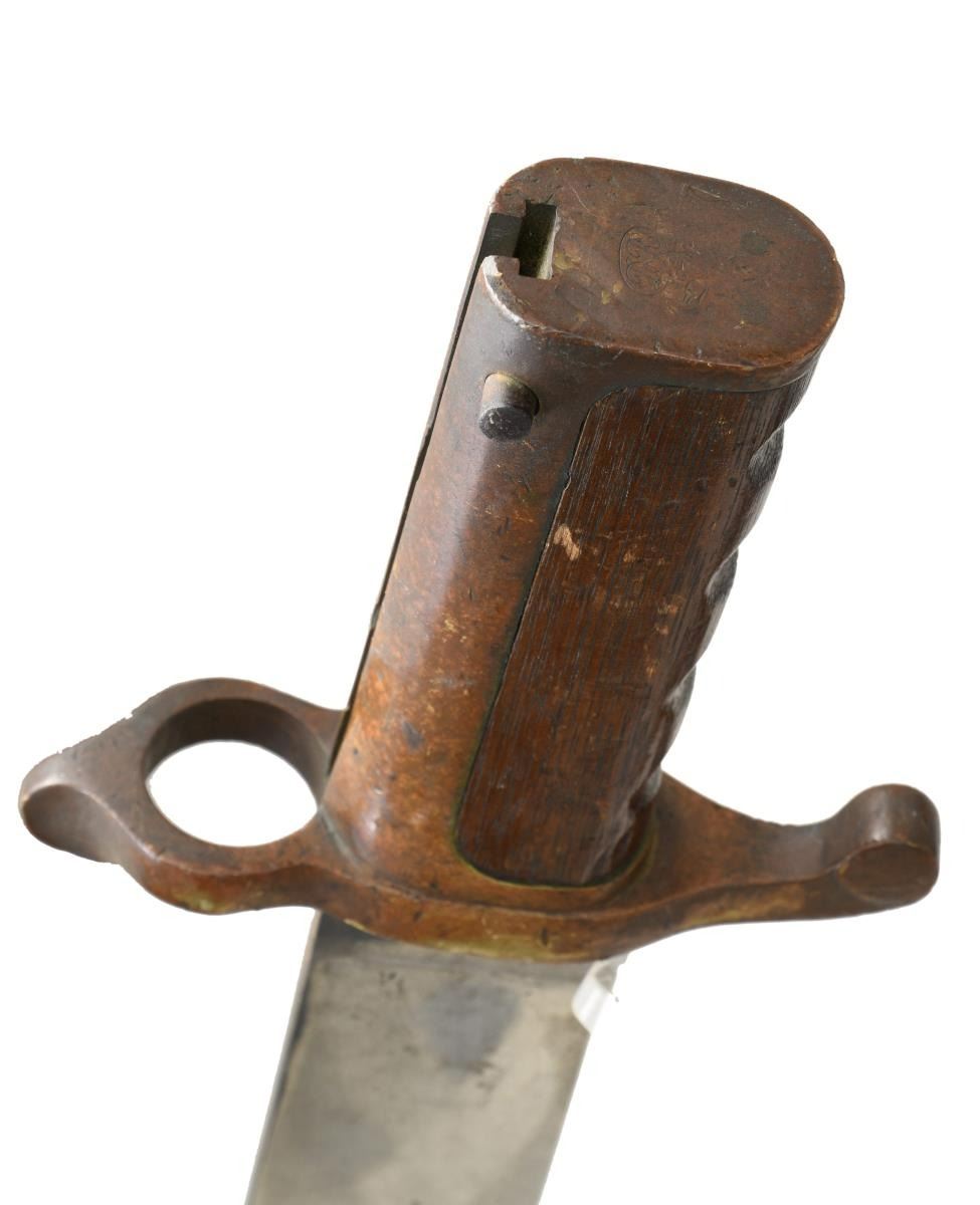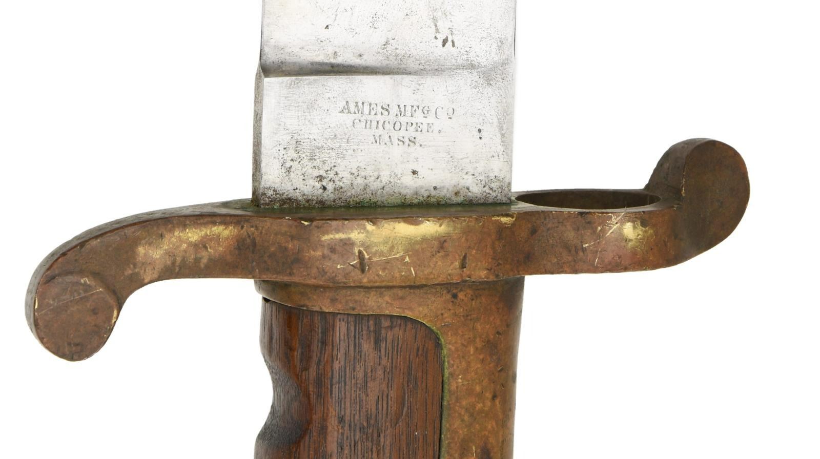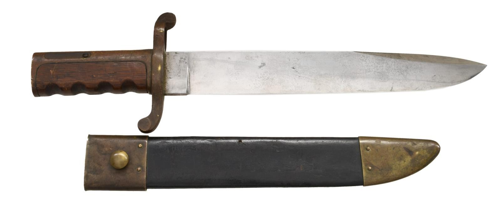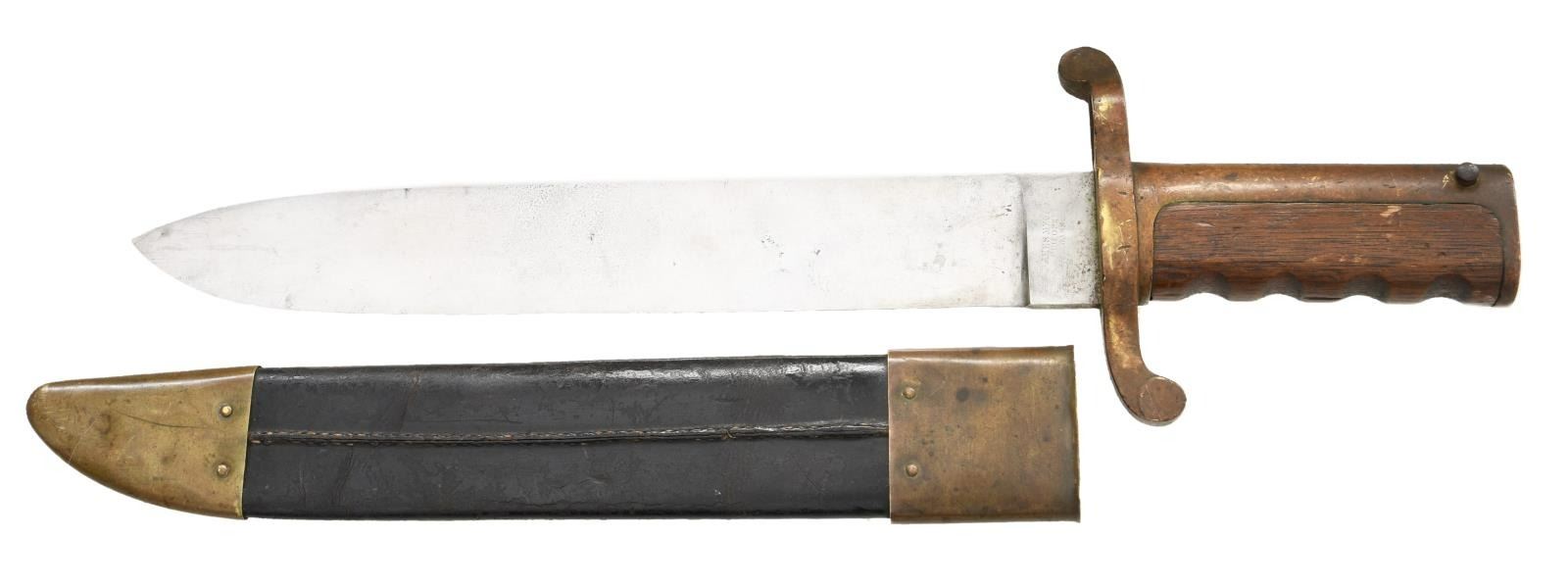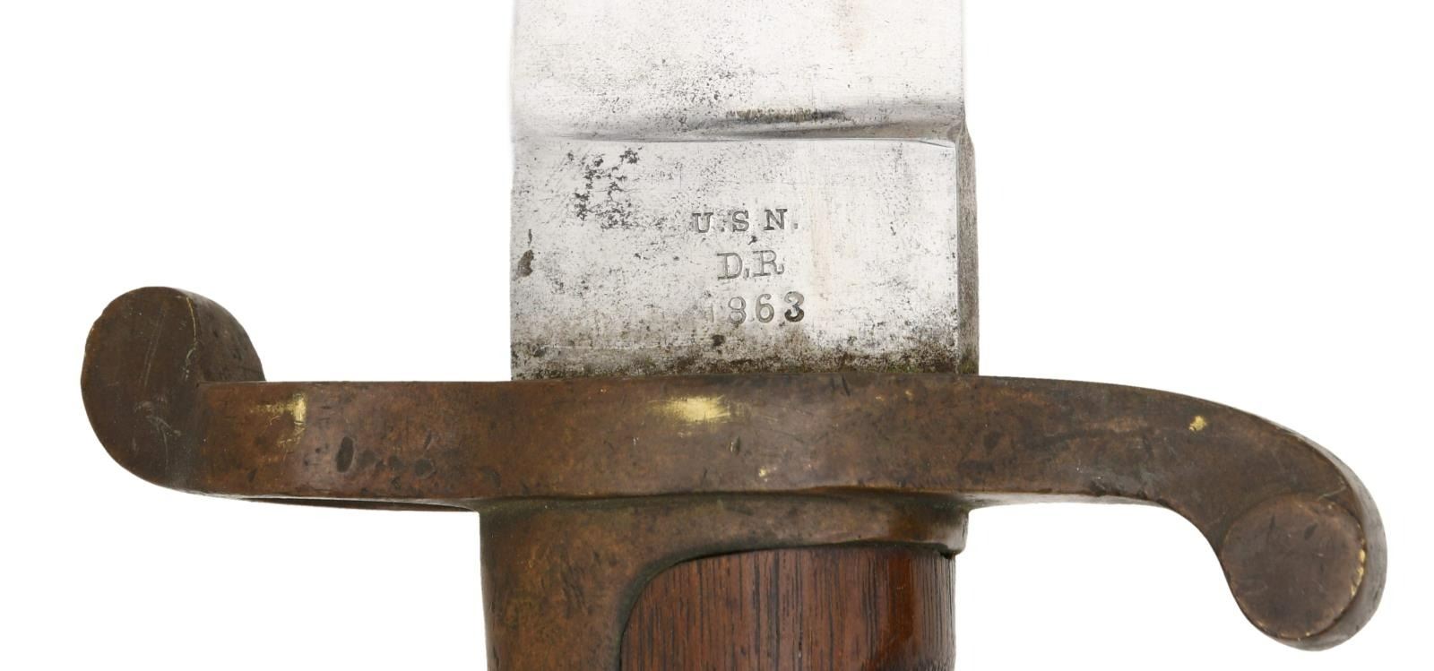 FOR US MODEL 1861 PLYMOUTH NAVY RIFLE. 16.5" Overall, 12" heavy blade w/ 5" clip point. "AMES MFG CO / CHICOPEE / MASS" on one ricasso & the other "U.S.N. / D.R / 1863", script "DR" cartouche stamped inspection on top of brass handle, wood grip. Original Dahlgren brass mounted sheath. CONDITION: fine overall. Blade retains most of its original luster, light staining, crisp markings. Brass grip & sheath mounts mixed light mustard patina. Sheath solid with scattered small scratches. (02-19983/JS). $1000-2000.