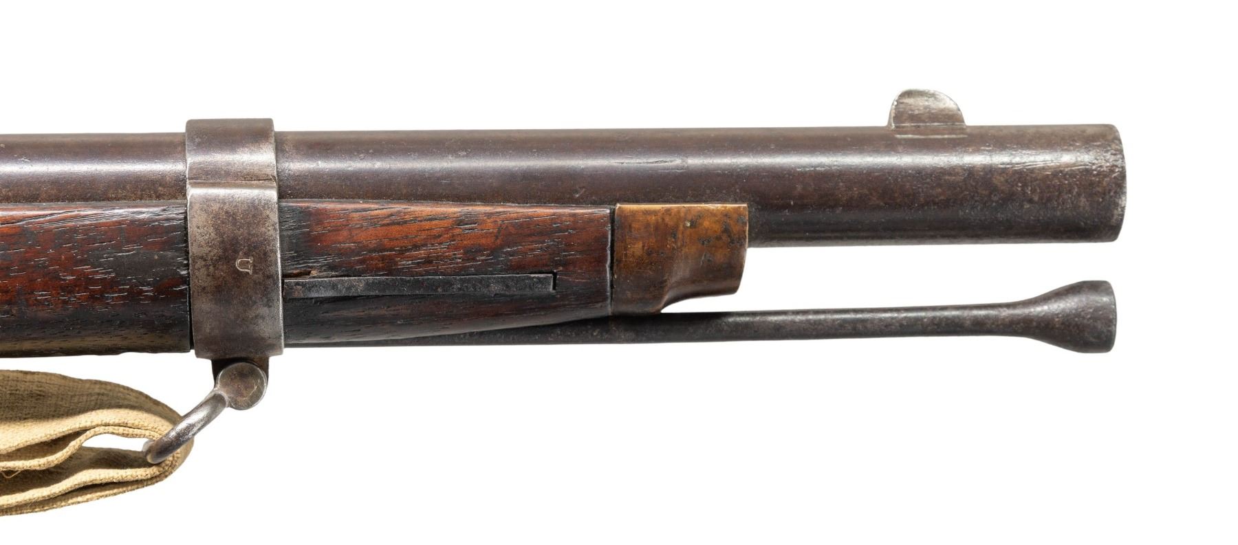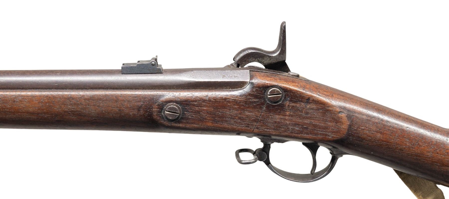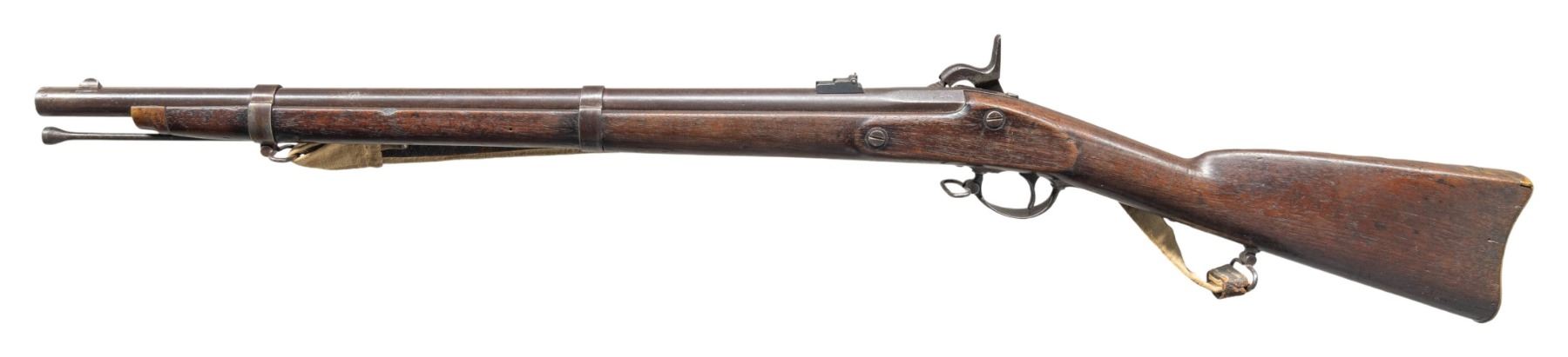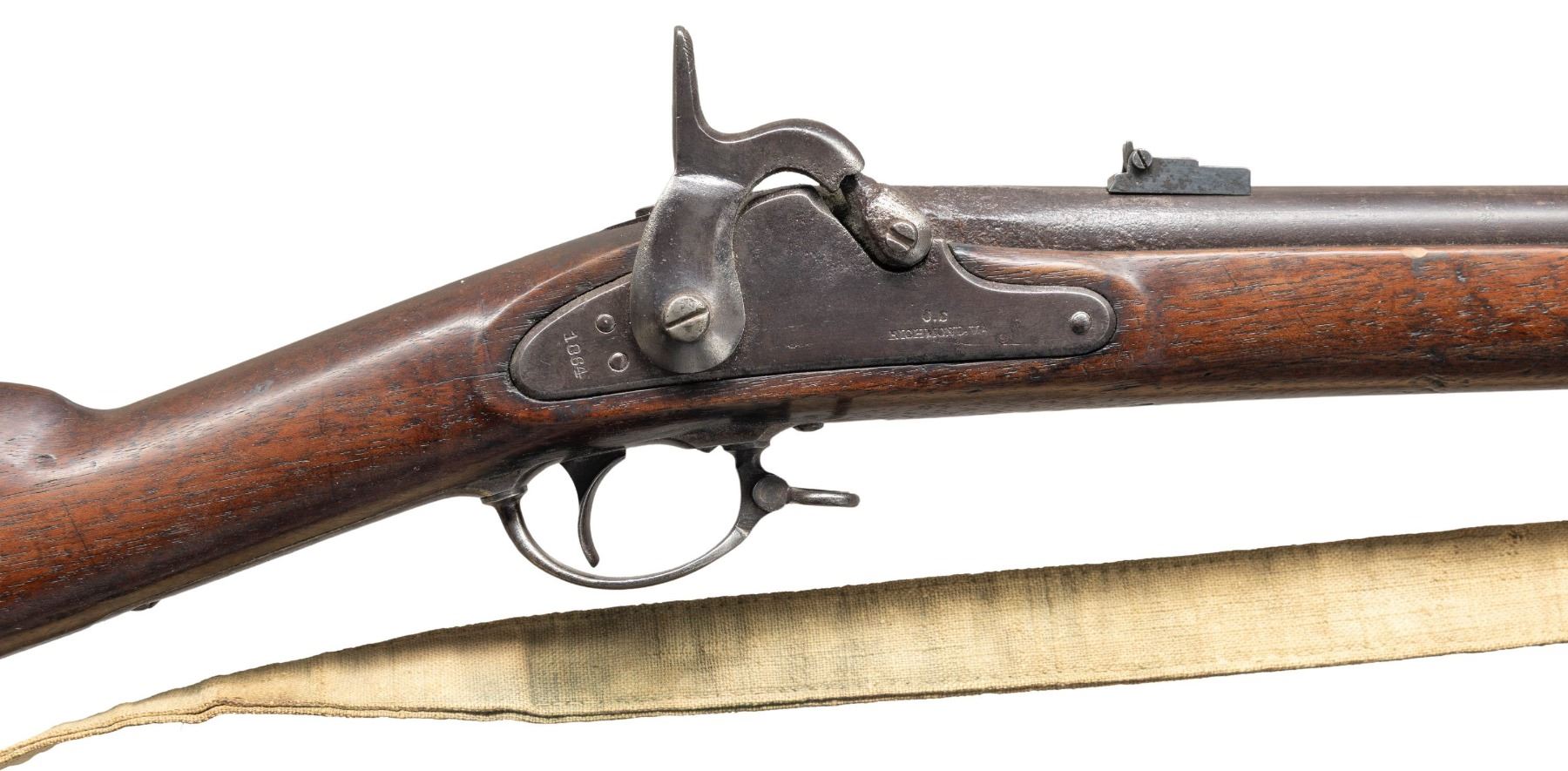Cal. 58. NSN. This is a superior example of Richmond Armory muzzle loading carbine. Standard configuration, 25" barrel, unique pinched front sight, adjustable rear carbine sight, brass buttplate & nose cap. Both barrel bands have characteristic Richmond style "U" stamped near center of band. Ramrod is original Richmond made tapered style, and unique Richmond set 3 sling swivels. Original Confederate canvas sling is attached. CONDITION: very good overall, shows honest use. All original & matching, rear sight is original replacement better than balance of carbine, mottled gray iron patina, brass has smooth dark mustard patina, stock is sound with hand worn patina. Large sliver between lock and tang missing and well patinaed over. mechanics fine, good dark rifled bore. Accompanying sling is matching good condition. PROVENANCE: Bob Alispones estate collection. (01-28692/JS). ANTIQUE. $6,000-8,000.