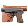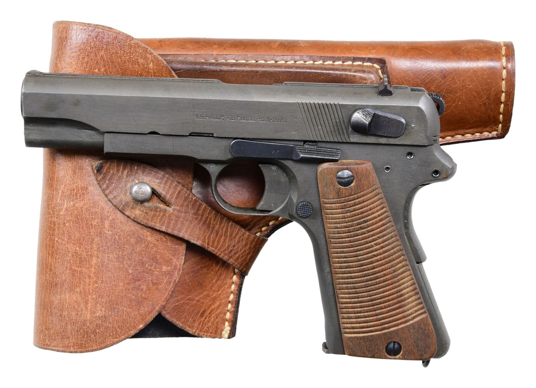 SEMI-AUTOMATIC PISTOL WITH HOLSTER. Cal. 9mm Luger. S# K5230. Bbl. 4 5/8". wz.35 (German designation P.35(P). ) semi-automatic pistol mfg. by Steyr in 1945. The left side of the slide is marked "F.B.RADOM VIS Mod.35.Nr.15567.", followed by an eagle firing proof and Steyr Eagle/WaA623 proof. Left side of the forward triggerguard web is marked with an indiscernible Eagle/WaA623 proof. Frame, grip safety, trigger, and slide exhibit a phosphate finish, with the bbl. being polished in-the-white, and with various small parts exhibiting a blue finish overall. Frame is mounted with 2-piece grooved wood grips. Slide features a grooved rib, with a fixed blade front sight, and dovetailed V-notch rear sight. All serialized parts are matching and include the frame, grip safety (left side), slide (underside), as well as the bbl. (last 3-digits on left side of lug). MAGS: 2 8-rd. mags. UNATTACHED ACCESSORIES: brown leather holster mfg. by Steyr marked with a partially discernible boxed "bnz" above a boxed "P.35" in white ink. Year of mfg. is illegible. CONDITION: excellent, with metal components retaining the vast majority of their original arsenal phosphate finish, exhibiting some light to mild wear and thinning, some superficial handling marks, as well as a few small spots of light to mild surface oxidation. Brilliant mirror bore, retaining well defined rifling throughout. Grips are very good, showing a few superficial handling marks, with the left panel exhibiting a crack that stems from the upper screw slot. Holster remains malleable, exhibiting wear, with areas of light to mild age related cracking and crazing present overall. A very nice example of a 1945 production wz.35 P.35(p) pistol. (24-6793/MLW). CURIO. $1,200-2,000.