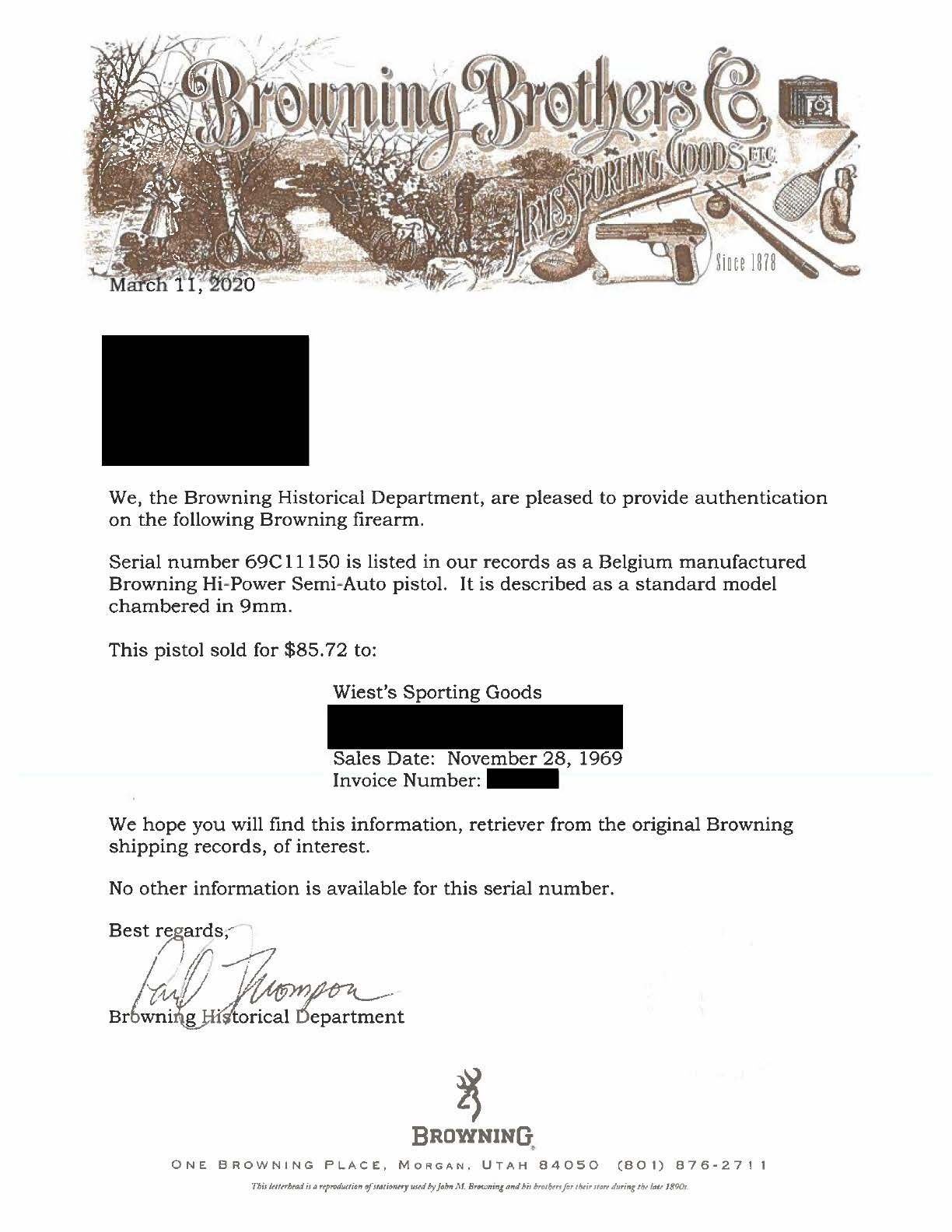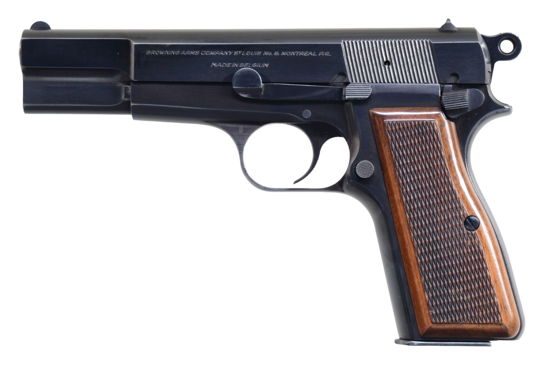 PISTOL WITH SOFT CASE. Cal. 9x19mm. S# 69C11150. Bbl. 4 5/8". Hi Power semi-automatic pistol mfg. in Belgium and imported by Browning Arms Company in 1969. The left side of the slide is marked with Browning's importer information above "MADE IN BELGIUM". Right side of forward trigger guard web exhibits a single Belgian commercial proof, with the right side of the 2-piece bbl. exhibiting several Belgian commercial proofs. Metal components exhibit a blue finish overall, save for on the bbl., which is polished in-the-white. Frame is mounted with 2-piece checkered wood grips. Fixed half-moon blade front sight, with dovetailed U-notch rear sight. MAGS: 1 13-rd., with phosphate finished body and blued button pattern floorplate. UNATTACHED ACCESSORIES: black leather Browning soft case. Pistol is also accompanied by a manual, as well as a letter from the Browning Historical Department, indicating that this pistol was sold for $85.72 on November 28th of 1969 to Wiest's Sporting Goods (Invoice #149966) in West Reading, PA. CONDITION: fine, with metal components retaining bountiful amounts of their original factory blue finish, exhibiting some spots of very light wear and thinning on high edges, with a few superficial handling marks present overall. Left side of slide exhibits a small area of light pitting. Mirror bore, exhibiting a few small streaks of what appears to be hardened grease, while retaining well defined rifling throughout. Grips show some smoothing and a few superficial marks from handling and storage, but otherwise remain sturdy and serviceable. Soft case shows some light wear, but is otherwise very good overall. PROVENANCE: From the Estate of Jon Thomas, Gunsport, LTD. (25-1138/MLW). CURIO. $700-1,100.