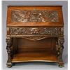 WITH WINGED GARGOYLES ATTRIBUTED TO R.J. HORNER. This beautiful early/late 19th century slant-lid carved desk features a lid with elaborate relief carved winged female figures on either side of a large case of flowers. The lid opens to reveal an interior with multiple compartments, sliding drawers and a central cabinet with door. Beneath is a full-length dovetail drawer with heavy relief carved North Wind face and filigree. This is all supported by a two-winged fierce griffin and full-length wooden shelf at base. SIZE: 37" l x 21" d x 39" h. CONDITION: has been beautifully refinished at some point in time and originally had a crest at the top. The peg holes for the top portion were properly plugged prior to the refinishing. Very nice overall. (05-1013/JJ). $1,500-2,500.